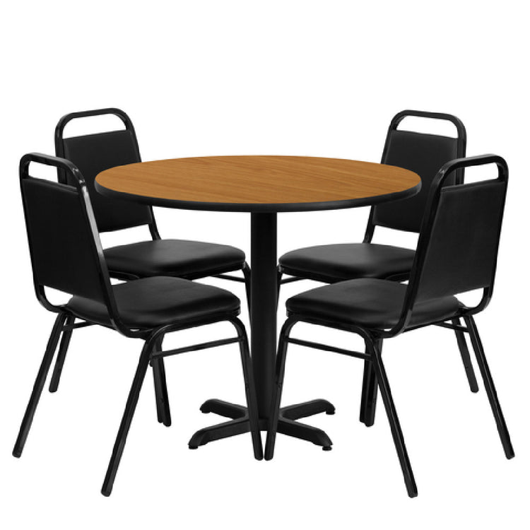 The Flash Furniture HDBF1003-GG Table And Banquet Chair Set is a commercial-grade indoor furniture ensemble designed for versatile hospitality environments. This set includes a 36-inch diameter round table with a high-impact melamine core MDF surface featuring a black T-mold edge, paired with four vinyl-upholstered banquet chairs. The chairs have a trapezoidal seamless back panel, each with a 17-1/2" W x 20-1/4" D seat, 34" height, and a 500 lb. weight capacity. The set’s sturdy cast iron x-base with a black powder-coated finish provides durability and stability. Precise technical details include a combined weight of 107 lbs, assembly requirement, and shipping in four separate boxes, making it suitable for high-traffic or multi-use settings.