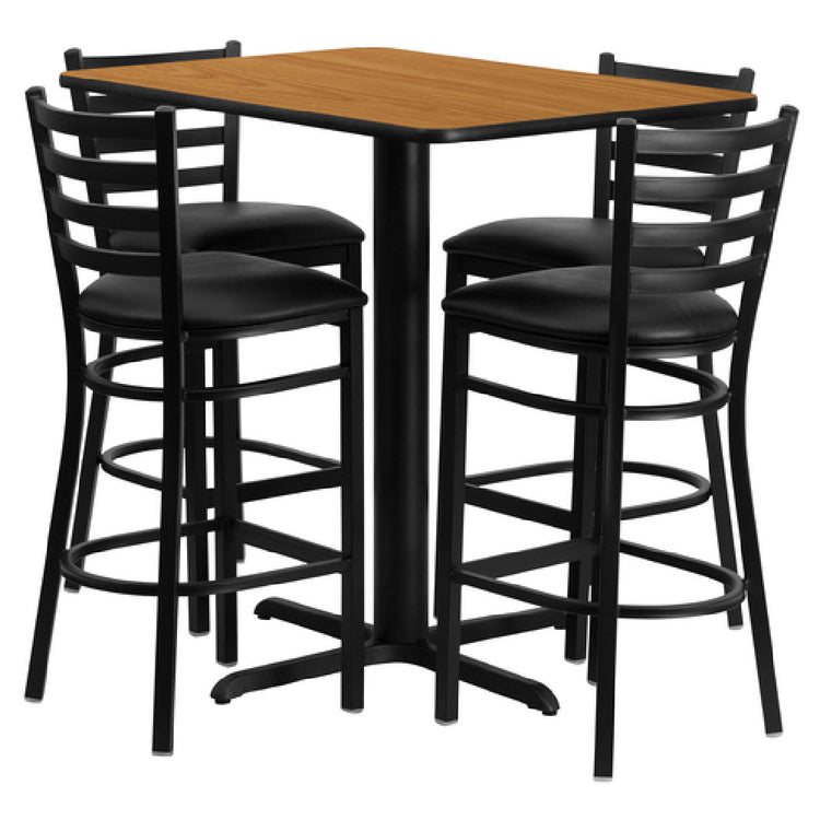 Flash Furniture, HDBF1019-GG, Table and Bar Stool Set, includes (1) 24"W x 42"D x 42"H table, square, black T-mold edge, MDF with high impact melamine core, natural laminate finish, cast iron x-base with black powder coat finish, (4) 17"W x 18"D x 42-1/4"H bar stools, metal ladder back, black vinyl upholstered padded seat, 2-1/2" thick CA117 fire retardant foam, welded joint assembly, (2) curved support bars, footrest, 18 gauge steel clear coated frame, plastic floor glides, designed for commercial and residential use (assembly required) (shipped in 5 boxes) (1-2 business days lead time)