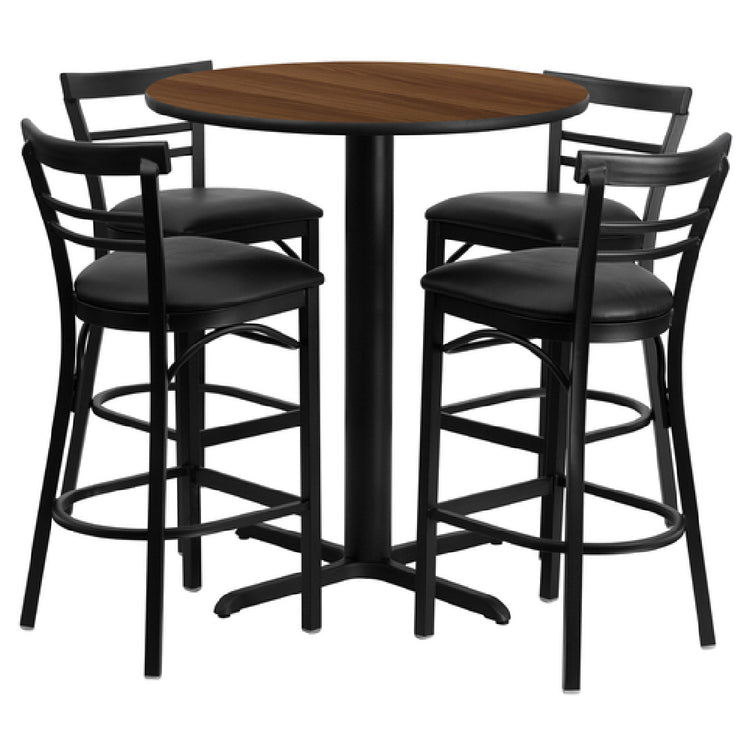 The Flash Furniture HDBF1036-GG set features a 42-inch height support structure with a 24-inch diameter round table, constructed from MDF with a high-impact melamine core and walnut laminate finish. The table weighs 102 lbs, with a freight class of 250, and is designed for indoor use in hospitality environments. The set comprises four chairs, each with a 17"W x 19"D x 41-3/4"H steel ladder-back frame, padded black vinyl seats with 2-1/2-inch fire-retardant foam, and welded support bars for enhanced stability. The frame utilizes a black powder-coated finish for corrosion resistance, and the entire ensemble requires minimal assembly. It integrates seamlessly with standard commercial power tools during installation and offers resilience against high-traffic use.