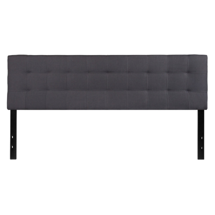 The Flash Furniture Bedford Headboard model HG-HB1704-K-DG-GG is a premium king size contemporary-style upholstered headboard designed for commercial and hospitality applications. Crafted with a tufted panel featuring a box stitch design, it offers a sophisticated aesthetic while providing durable functionality for hotel rooms, upscale guest suites, or luxury residential bedrooms. Its dark gray fabric upholstery is complemented by black metal stands with adjustable bed rail slots, enabling secure attachment to compatible bed frames. The headboard measures 78.75 inches in width and 54.25 inches in height, with a depth of 2.75 inches, and weighs approximately 38 pounds, ensuring stability and ease of installation in high-end hospitality environments.