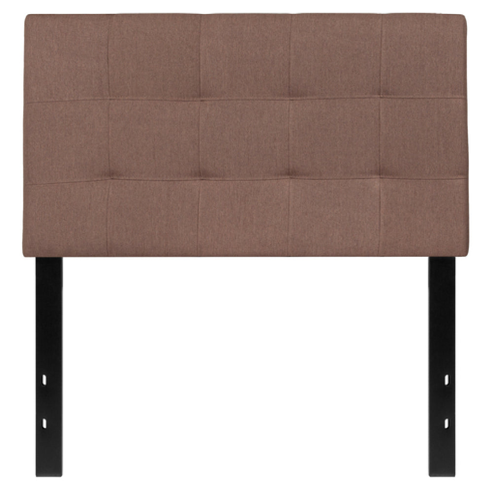The Flash Furniture Bedford Headboard Twin Size in contemporary style is a commercial-grade upholstered headboard designed for residential and hospitality applications. It features a tufted panel with box stitch detailing, crafted from durable fabric in a sleek camel hue. The headboard attaches securely with black metal stands equipped with adjustable bed rail slots, ensuring compatibility with twin beds. Its height of 54.25 inches, width of 39.25 inches, and 2.5-inch depth provide a balanced profile suitable for modern interiors. This model combines aesthetic appeal with technical robustness, making it ideal for commercial guest rooms, multi-unit housing, or high-end residential projects requiring reliable performance and contemporary design.