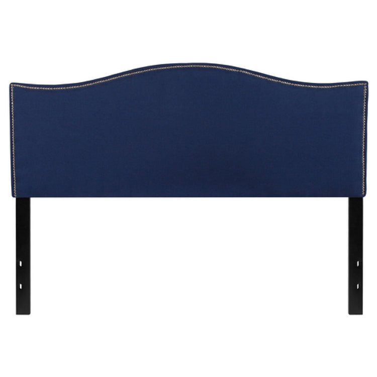 The Flash Furniture HG-HB1707-Q-N-GG Lexington Headboard is a conventionally designed queen size headboard crafted by Flash Furniture, featuring a transitional style suitable for various interior decor themes. It consists of an upholstered panel with an arched top and brass nailhead trim, providing an aesthetically appealing focal point for beds in both residential and hospitality settings. The headboard is supported by black metal stands with adjustable bed rail slots, ensuring compatibility with different mattress heights and frame configurations. Constructed with durable fabric in a navy finish, it combines stability and ease of maintenance, making it a precise choice for commercial and upscale residential bedrooms requiring sturdy, stylish headboard solutions.