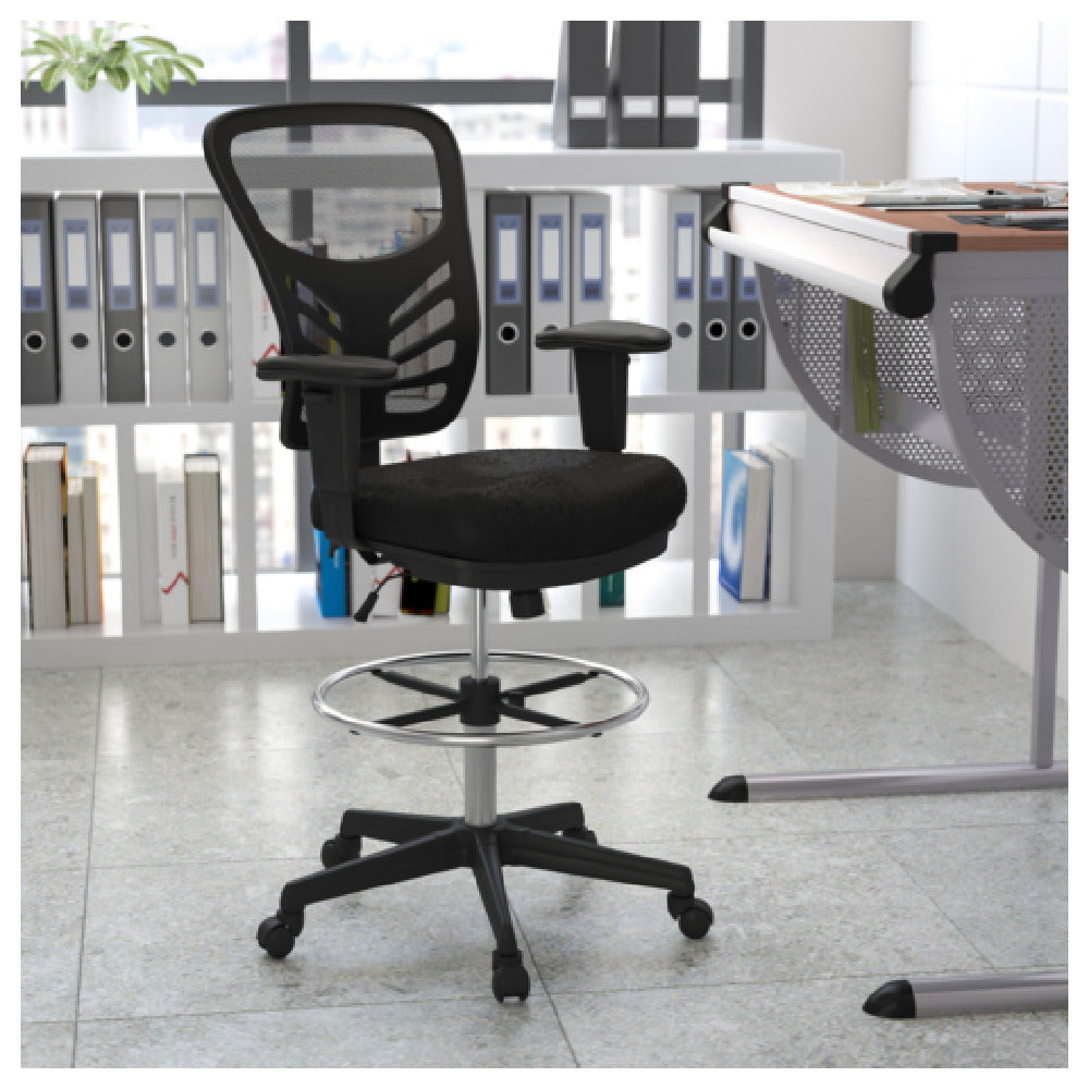 The Flash Furniture HL-0001-1CBLACK-GG Tyler Drafting Chair is a professional-grade ergonomic seating solution designed for commercial work environments requiring adjustable comfort and durability. This chair features a height-adjustable seat from 23-1/2" to 31-1/2", enabling precise user customization for various drafting and workstation tasks. Its mid-back design provides essential lumbar support, while the padded mesh upholstered seat enhances comfort during prolonged use. Constructed with a sturdy nylon base, dual wheel casters, and a pneumatic height adjustment system, this chair meets demanding industry standards for heavy-duty performance and ease of maintenance, making it suitable for design studios, architectural firms, and technical workspaces. Its robust 250 lb. weight capacity and fire-retardant CA117 foam ensure safety and longevity in high-traffic settings.