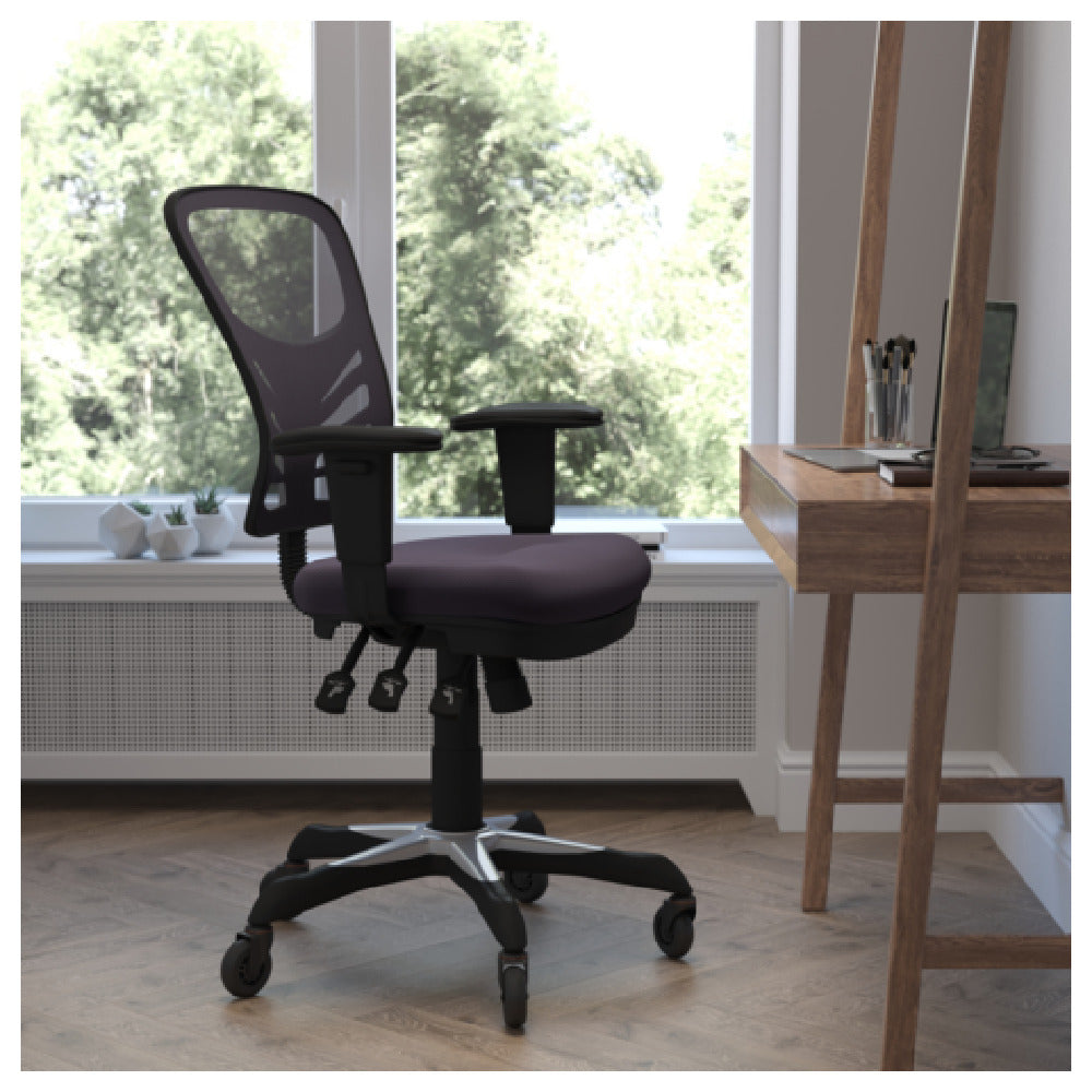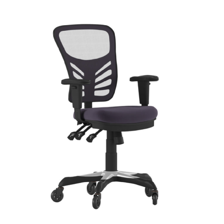 The Flash Furniture HL-0001-DK-GY-RLB-GG Nicholas Swivel Task Chair is a versatile ergonomic seating solution designed for commercial workspaces, including offices, control rooms, and healthcare facilities. This adjustable height chair features a mesh back for enhanced breathability and a padded mesh upholstered seat for comfort during extended periods of use. Its mid-back design provides lumbar support, facilitating proper posture. With a height range of 37" to 44-1/4", it caters to diverse user preferences, supporting up to 250 lbs. The chair incorporates a triple paddle control mechanism, infinite-locking back angle adjustment, multi-tilt lock, and tilt tension control, ensuring stability and precise ergonomic adjustment. Heavy-duty black nylon base with silver accents and ball-bearing poly roller wheels enable smooth movement and durability in high-use environments.