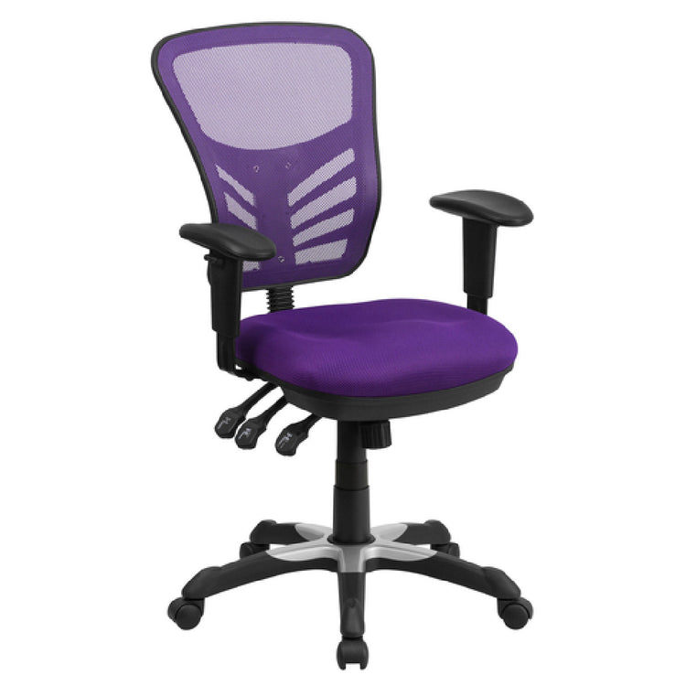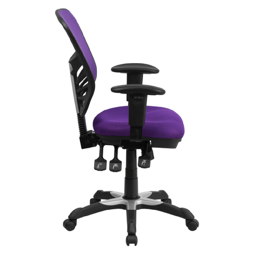 The Flash Furniture HL-0001-PUR-GG Swivel Task Chair is a commercial-grade ergonomic seating solution designed for professional work environments requiring adjustable height and high durability. This chair features a mid-back mesh design with a 2-inch adjustable mesh back and a padded mesh upholstered seat, supporting users up to 250 lbs. Its sleek black nylon base with silver accents, injection-molded for longevity, incorporates dual wheel casters for smooth mobility. An innovative triple paddle control mechanism offers infinite-locking back angle adjustment and multi-tilt locking, complemented by tilt tension control for customized comfort. The chair's adjustable padded arms and fire-retardant foam meet safety standards, making it suitable for demanding office and hospitality applications where ergonomic support and durability are critical. Key specs include a height range of 36-3/4" to 43-1/2", width of 25.75", depth of 27.5", and a weight of 40 lbs, ensuring versatile fit and stable operation in dynamic workspaces.