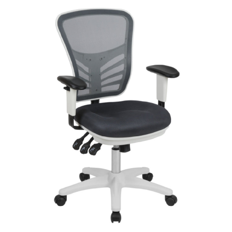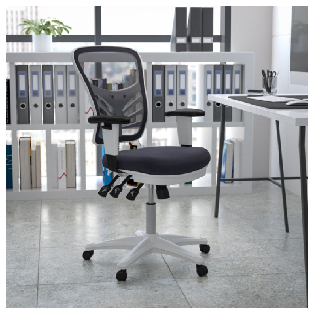 The Flash Furniture HL-0001-WH-DKGY-GG Nicholas Swivel Task Chair is a versatile and durable seating solution designed for professional work environments. This commercial-grade swivel chair features an adjustable height range of 37" to 44-1/4", supporting up to 300 lbs. Its mesh back provides breathability, while the padded mesh upholstered seat offers enhanced comfort for extended periods of use. Equipped with a built-in lumbar support and a triple paddle control mechanism, it allows precise ergonomic adjustments, including an infinite-locking back angle and multi-tilt lock. The chair’s heavy-duty nylon base with dual-wheel casters ensures stability and ease of mobility, making it well-suited for office settings, technology centers, or customer service areas where ergonomic and reliable seating is critical.