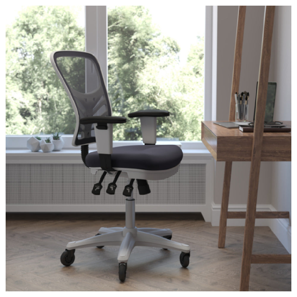 The Flash Furniture Nicholas Swivel Task Chair is engineered for efficient performance in busy workplaces. It operates with a hydraulic lift mechanism compatible with standard office power sources, supporting height adjustments from 37" to 44-1/4". Its mesh backrest enhances airflow, aiding in user comfort during extended use, while the padded mesh upholstered seat ensures durability and ergonomic support. The chair’s frame features a white finish, complemented by dark gray mesh fabric for aesthetic versatility. Its heavy-duty nylon base with ball-bearing poly roller wheels supports frequent mobility, and the tilt mechanisms—including multi-tilt lock and tilt tension adjustment—favor customizable ergonomic positioning. The chair complies with safety standards, utilizing fire-retardant foam and robust materials for sustained productivity. It weighs approximately 43 lbs., with capacity for 300 lbs., and ships without requiring special electrical connections, supporting standard commercial workflows.