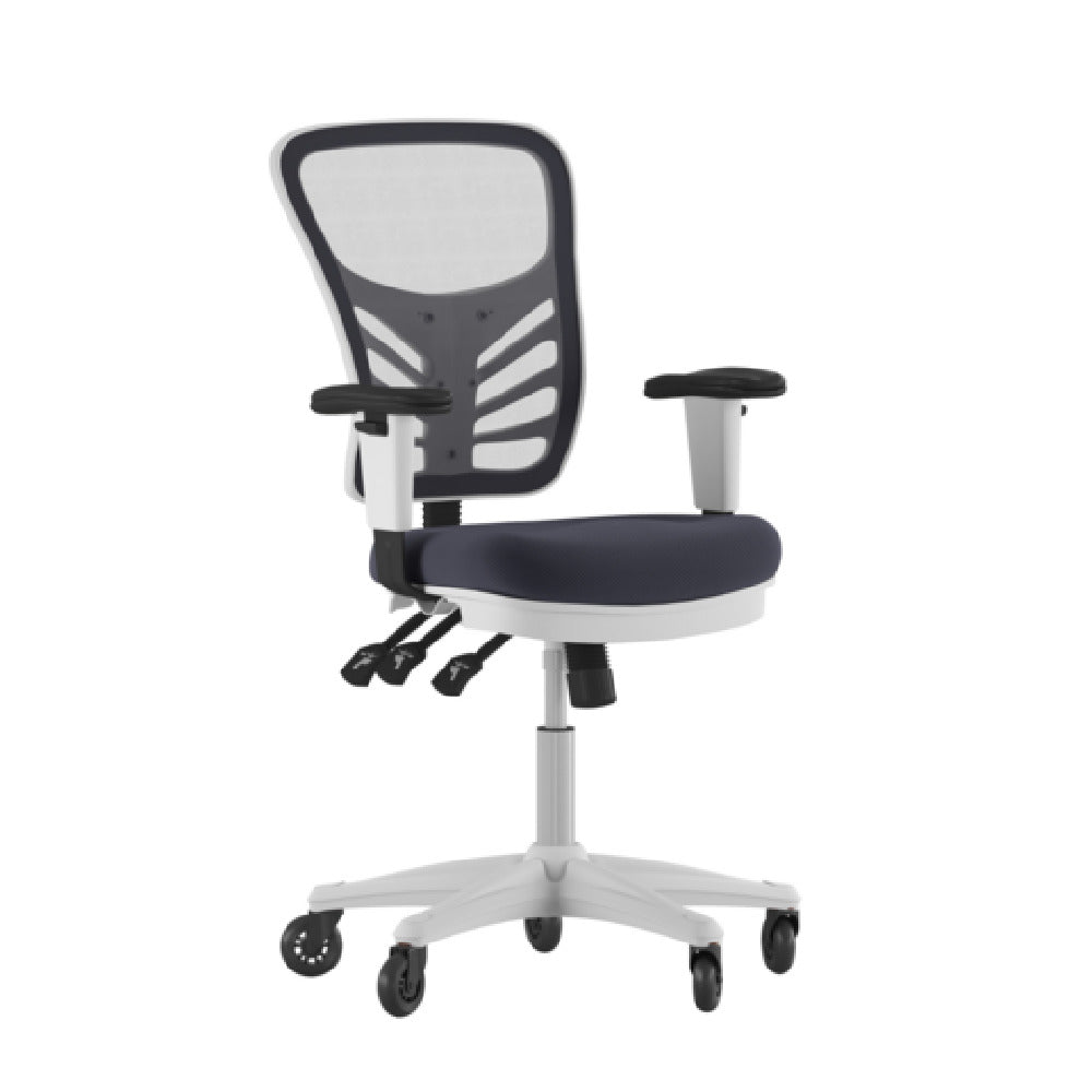 The Flash Furniture HL-0001-WH-DKGY-RLB-GG Nicholas Swivel Task Chair is a professional-grade ergonomic seating solution designed for commercial office environments and task-oriented workflows. This swivel chair features an adjustable height range from 37" to 44-1/4", enabling customized positioning for diverse user needs. Constructed with a durable mesh backrest and a padded mesh upholstered seat, it provides optimal breathability and comfort for prolonged use. Equipped with built-in lumbar support, heavy-duty nylon base, and ball-bearing poly roller wheels, this chair ensures stability and mobility under demanding workloads. Its technical design supports a weight capacity of 300 lbs, making it suitable for active, high-traffic settings. The model’s comprehensive control mechanisms—including triple paddle adjustment, lockable back tilt, and tension control—offer precise ergonomic customization for efficient workflow management in commercial office, healthcare, or hospitality settings.