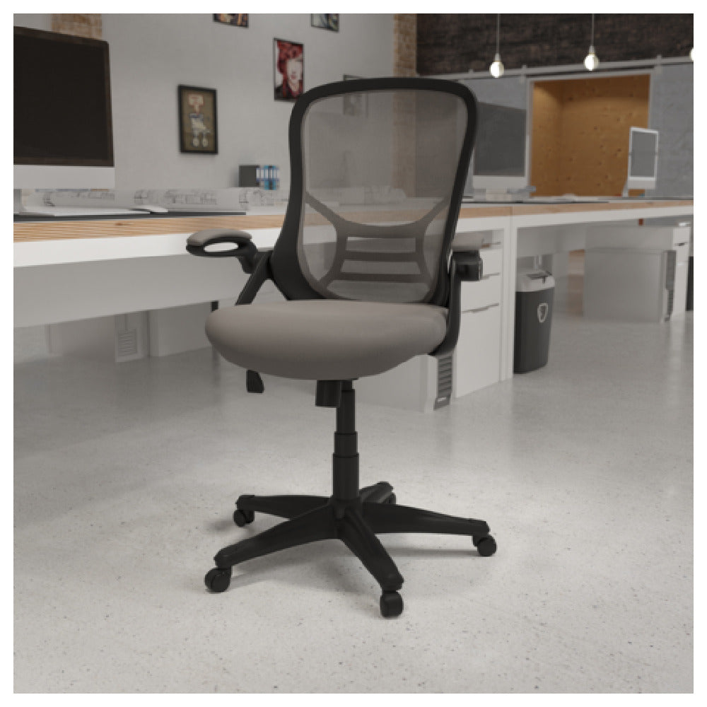 The Flash Furniture HL-0016-1-BK-GY-GG Porter Swivel Office Chair is a commercial-grade seating solution designed for professional workspaces requiring ergonomic comfort and durability. This high-back swivel chair features an adjustable height range of 40-1/4" to 44", ideal for customizable user fit in office environments or administrative areas. Its mesh back promotes airflow, while the padded mesh upholstered seat offers prolonged comfort, supporting users up to 250 lbs. The built-in lumbar support enhances posture, and the tilt lock mechanism with tilt tension adjustment allows seamless ergonomic adjustments. Completed with a sturdy nylon base, dual-wheel casters, and flip-up padded arms, this model prioritizes mobility and ease of maintenance for high-traffic use scenarios and dynamic work settings.