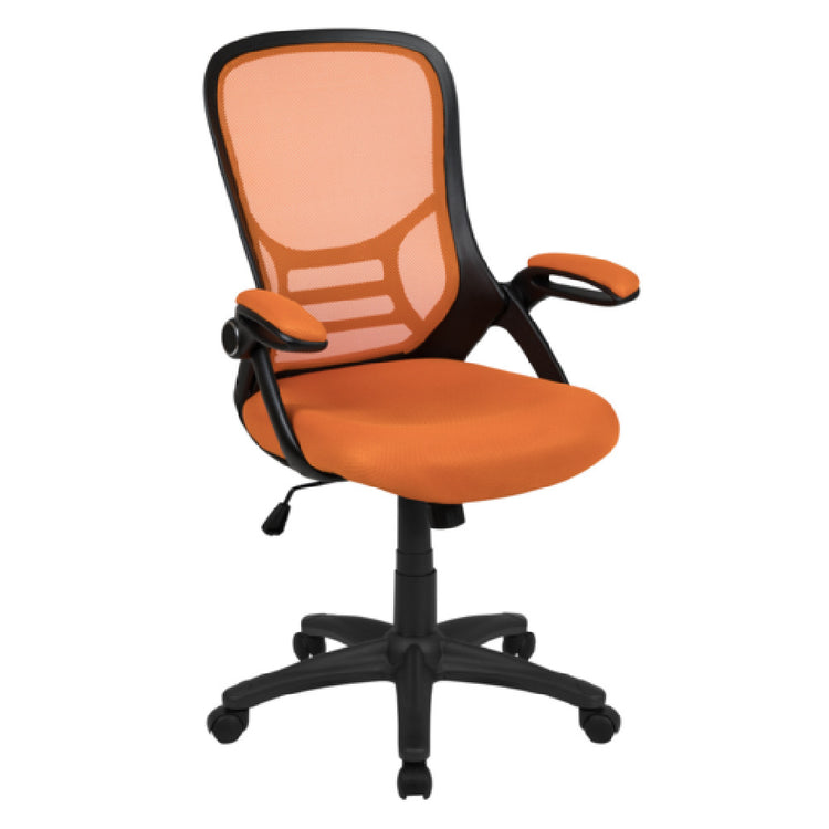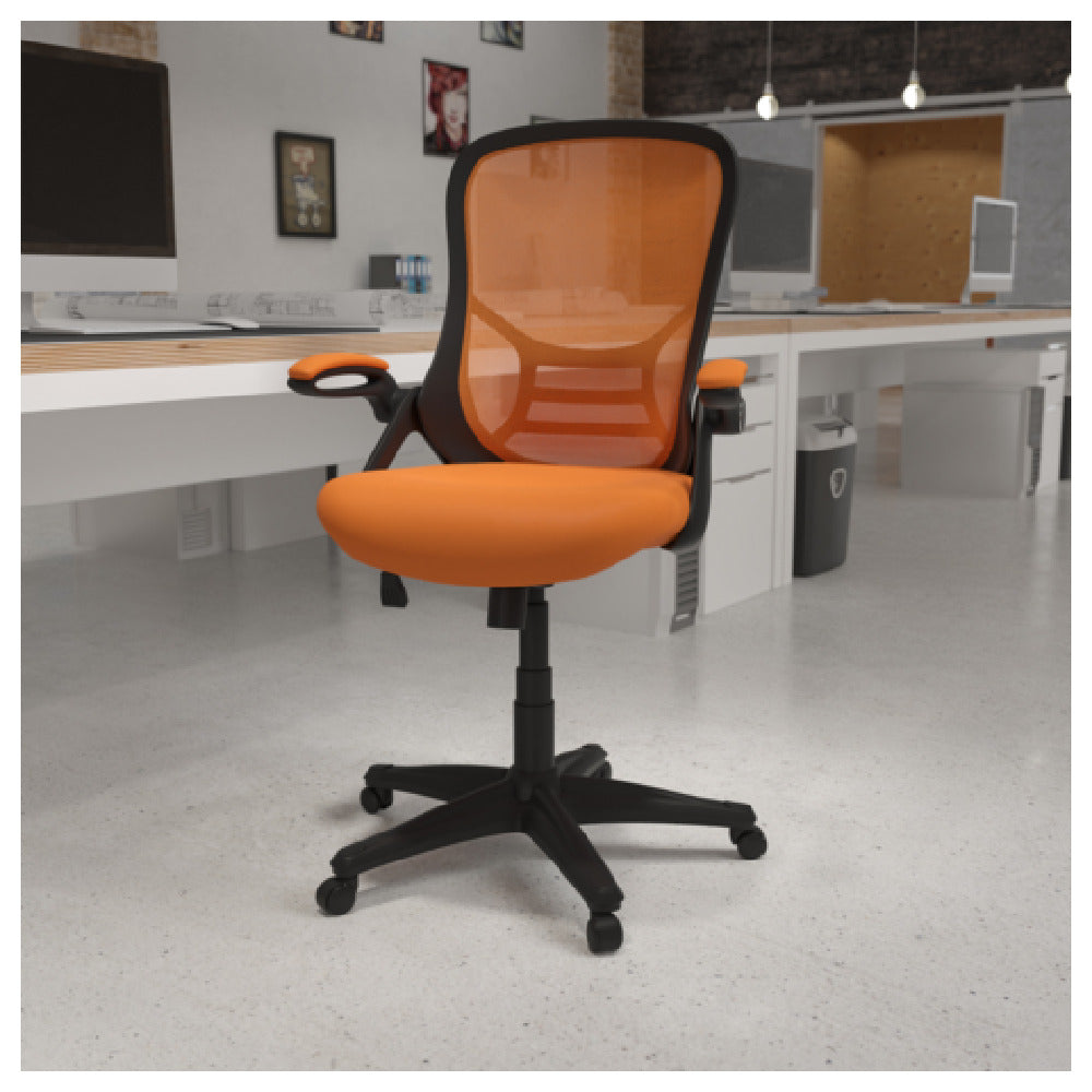 Flash Furniture, HL-0016-1-BK-OR-GG, Porter Swivel Office Chair, 40-1/4" to 44" adjustable height, 250 lb. weight capacity, high back design, mesh back, padded mesh upholstered seat, built-in lumbar support, tilt lock mechanism, tilt tension adjustment knob, flip-up padded arms, CA117 fire retardant foam, nylon base, dual wheel casters, black frame, orange mesh (assembly required)
