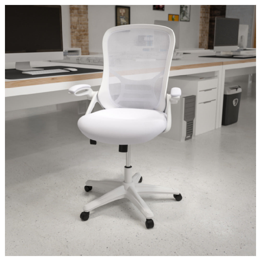 Why choose the Flash Furniture HL-0016-1-WH-WH-GG over similar office chairs? Its premium mesh-back design with comprehensive ergonomic adjustments enhances user comfort across diverse work environments. The high-capacity nylon base and durable fabric upholstery ensure long-lasting performance, while features like tilt lock and flip-up padded arms improve workspace versatility and productivity. Its precise height adjustment and smooth mobility set it apart as a robust, reliable office seating option built for daily commercial use.