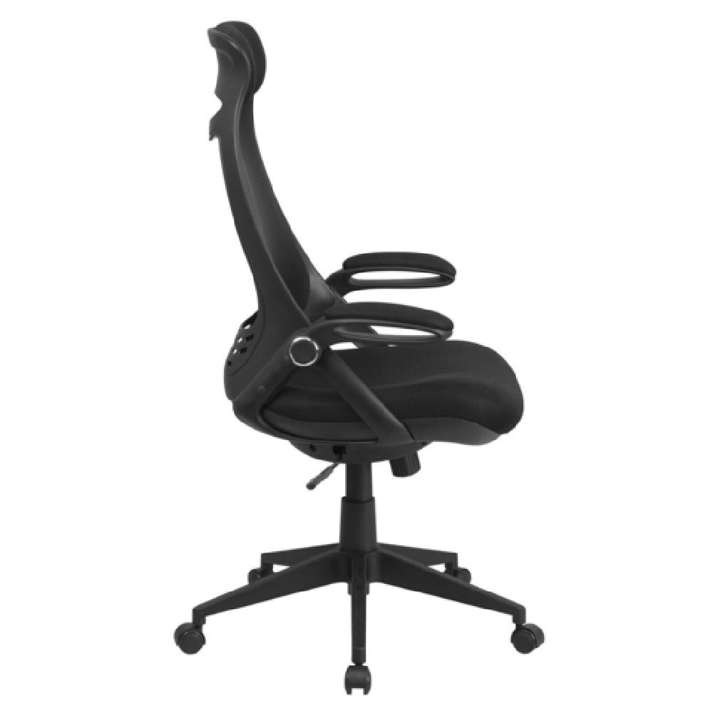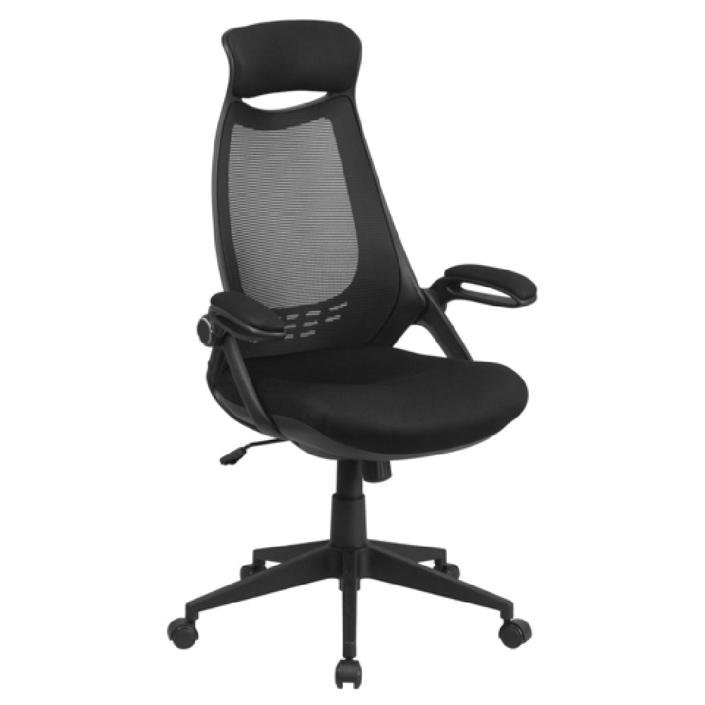 Flash Furniture, HL-0018-GG, Executive Swivel Office Chair, 45-3/4" to 48-1/4" adjustable height, 250 lb. weight capacity, high back design, with headrest, mesh back, padded mesh upholstered waterfall seat, built-in lumbar support, tilt lock mechanism, tilt tension adjustment knob, padded flip-up arms, CA117 fire retardant foam, heavy duty black nylon base, dual wheel casters, black (assembly required) (in stock items usually ship within 24 hours)