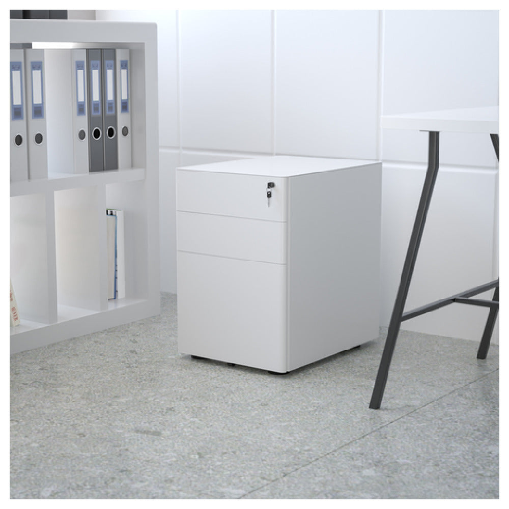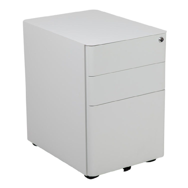 The Flash Furniture HZ-CHPL-01-W-GG Mobile Drawer Cabinet features a robust steel construction with dimensions of 15-1/2\"W x 21\"D x 22-3/4\"H, and a weight of 55 lbs. Its three-tier design includes two utility drawers measuring 13\" x 18-3/4\" x 4-1/2\" and a file drawer of 13\" x 18-3/4\" x 11-1/2\", all housed within a powder-coated white finish that resists corrosion and facilitates cleaning. Equipped with four low profile casters for mobility, the cabinet allows for flexible placement. The unit supports secure storage with a lockable top drawer. Its construction ensures stability and longevity in high-use foodservice environments, while the overall dimensions and weight optimize ease of transport and durability during daily operation. Installation and maintenance involve straightforward cleaning routines with disassembly of removable parts as needed; ventilation clearance should accommodate caster movement.