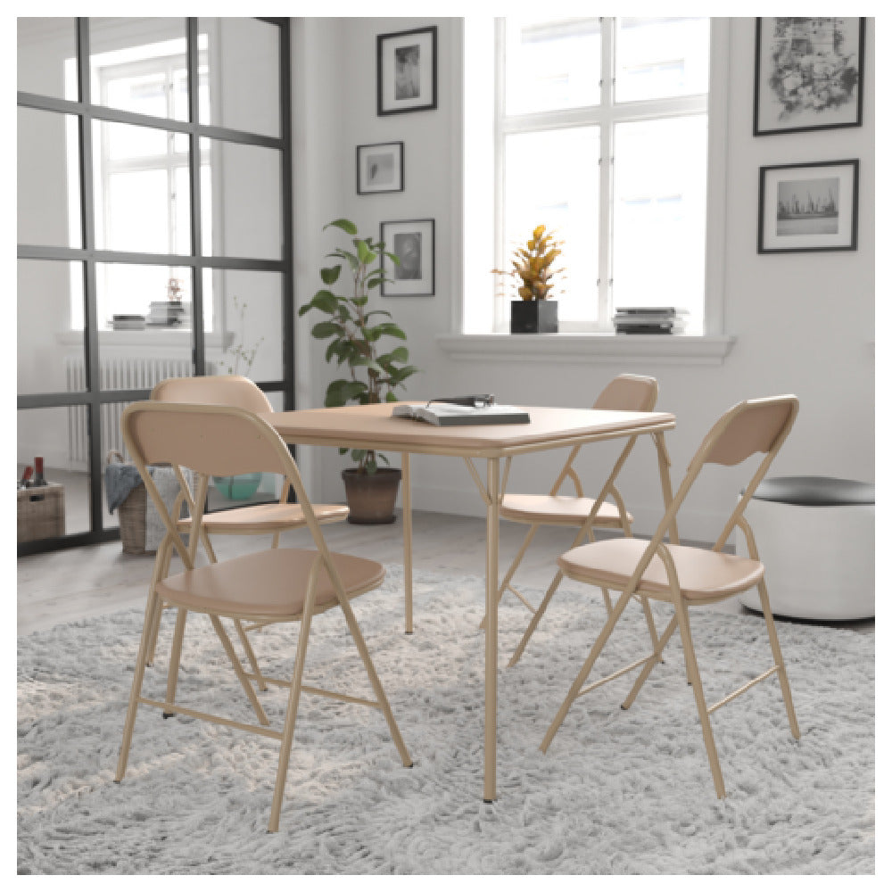The Flash Furniture JB-1-TAN-GG Madison Folding Card Table and Chair Set is a versatile commercial-grade seating solution designed for indoor use in foodservice environments. This set features a square folding table measuring 33-1/2 inches in width and depth with a height of 27-3/4 inches, suitable for quick setup and breakdown in various hospitality settings. The 3/16-inch thick padded vinyl tabletop provides durability and ease of cleaning, while powder-coated metal legs ensure resistance to corrosion and frequent handling. The set includes four foldable chairs with a static load capacity of 300 pounds, offering stable seating for staff or guests. Its high weight capacity and compact design make it ideal for cafes, banquets, catering, or temporary dining arrangements, providing a reliable solution for space management and logistics efficiency.