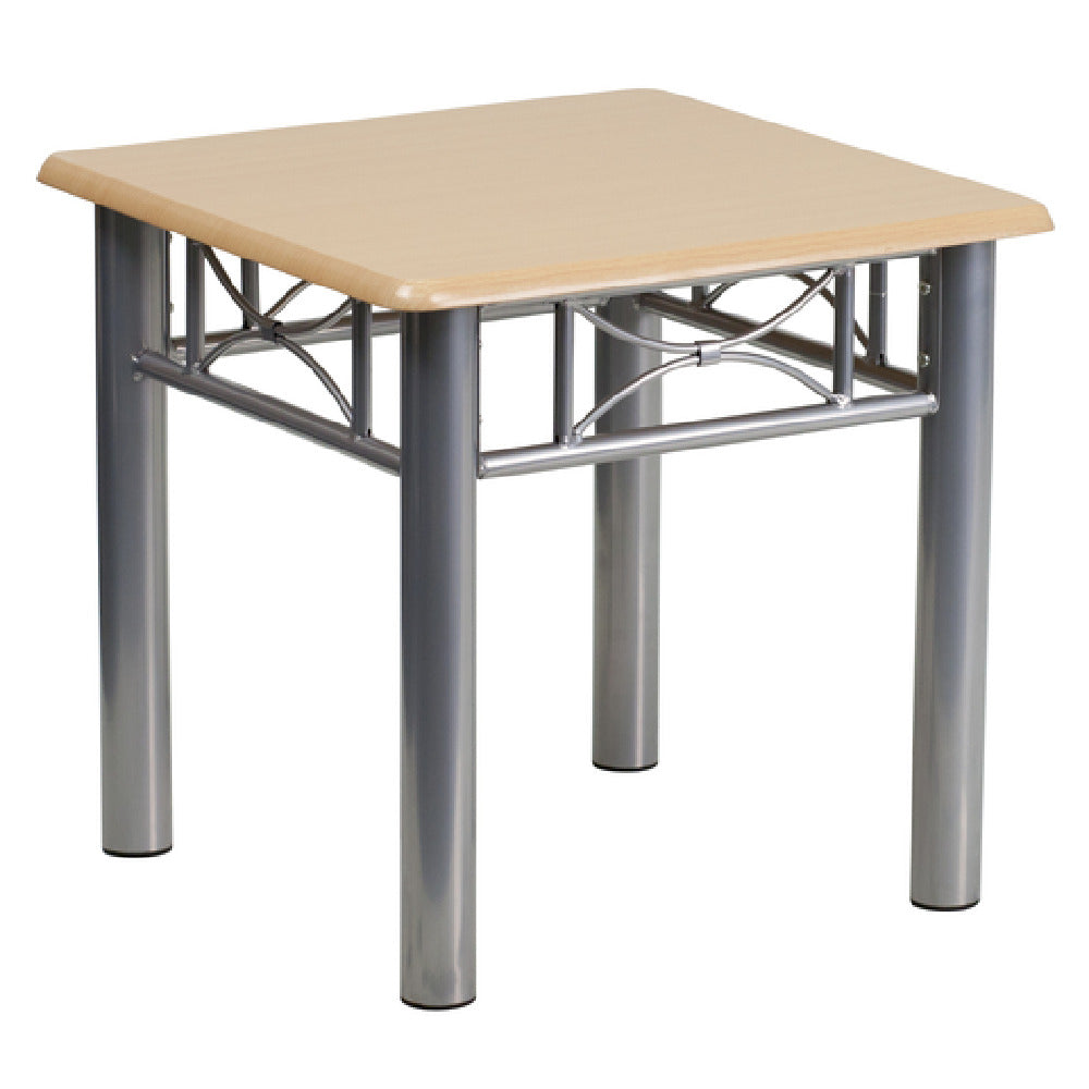 The Flash Furniture JB-6-END-NAT-GG End Table is a commercial-grade low-height accent piece designed for indoor foodservice and hospitality settings. Measuring 21 inches in width and depth with a height of 19-3/4 inches, it features a durable 3/4-inch thick natural laminate top supported by a robust silver steel frame. This end table is optimized for use in restaurant lounges, hotel suites, or professional waiting areas, providing a stable surface for beverages, menus, or decorative accents while maintaining a sleek, modern appearance.