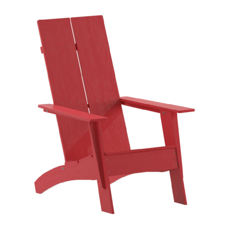 The Flash Furniture JJ-C14509-RED-GG Sawyer Modern Adirondack Chair features a weather-resistant all-weather poly resin wood construction that offers robust durability against UV exposure, moisture, and temperature variations. Its overall dimensions are 30.5 inches in width, 37.5 inches in depth, and 39.5 inches in height, with a shipping weight of 41 lbs. The chair is designed for commercial outdoor applications, providing a stable base with a 16-inch seat height and a maximum load capacity suitable for adult users. Maintenance involves simple wiping and periodic cleaning with mild detergent. The vibrant red color adds visual impact while maintaining resistance to fading. Built with ergonomic contours, it supports guest comfort in outdoor settings, making it well-suited for hospitality use in high-traffic outdoor dining areas, patios, and poolside applications. The chair’s lightweight design enhances repositioning ease in dynamic outdoor environments.