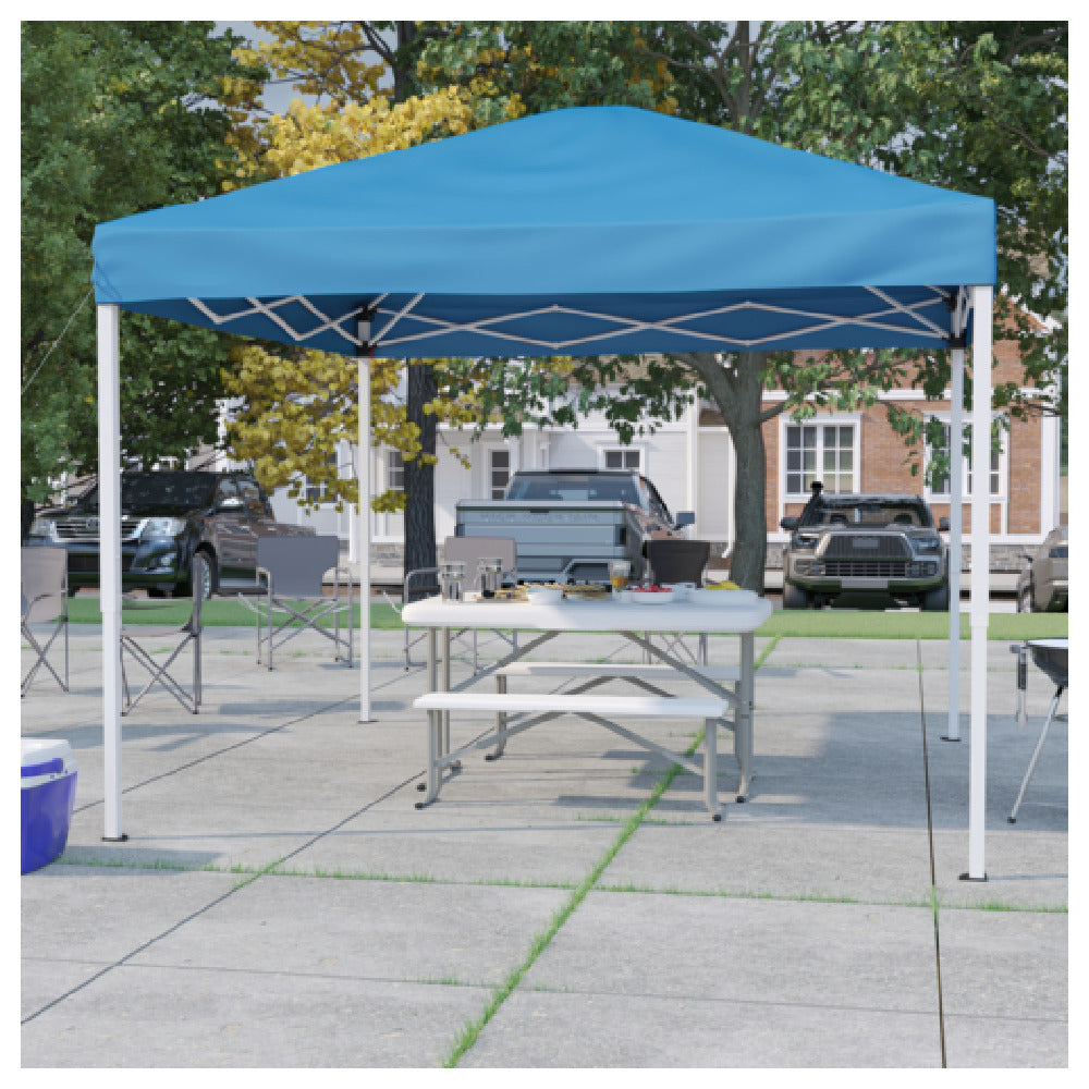 A commercial pavilion or tent is a weather-resistant structure designed for outdoor foodservice and event applications, providing shade, shelter, and flexible seating arrangements. These tents are typically constructed with durable fabrics and robust framing to withstand outdoor conditions and frequent use. The Flash Furniture Knox Pop-up Canopy Tent and Folding Bench Set, priced at $30 off, is installed in various outdoor foodservice settings such as markets, festivals, and catering stations. Its metal frame and weatherproof canopy make it suitable for moderate workloads in environments requiring swift deployment and compact storage, supporting efficient outdoor operations in hospitality and catering industries.