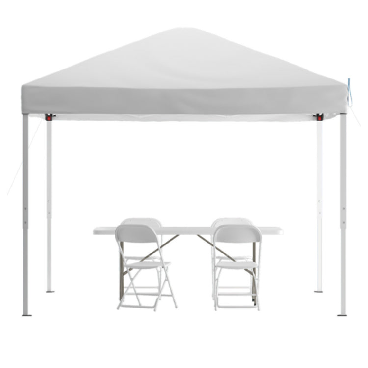 This outdoor pavilion and tent set from Flash Furniture features a sturdy aluminum frame with a height of 106 inches, width and depth of 116 inches, and a combined weight of 91 pounds. The product is designed for short- to mid-term outdoor use, with a weather-resistant fabric canopy that offers UV and water resistance. The set includes a 10'x10' canopy tent with a protective carrying case, a 6' bi-fold table with handle for easy mobility, and four white foldable chairs, all supporting quick assembly and disassembly. Its construction supports outdoor foodservice activities such as catering, outdoor markets, and event hospitality, with straightforward maintenance and reliable performance.