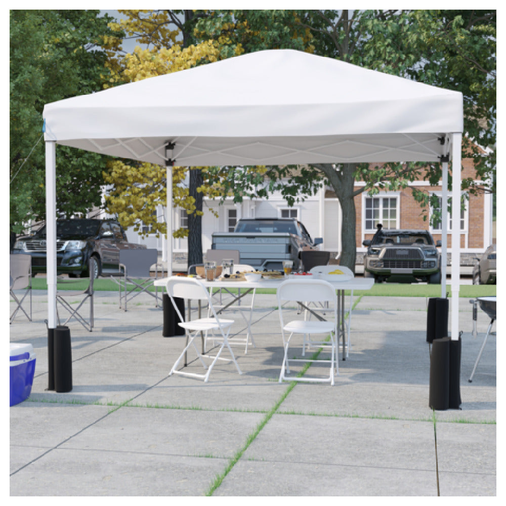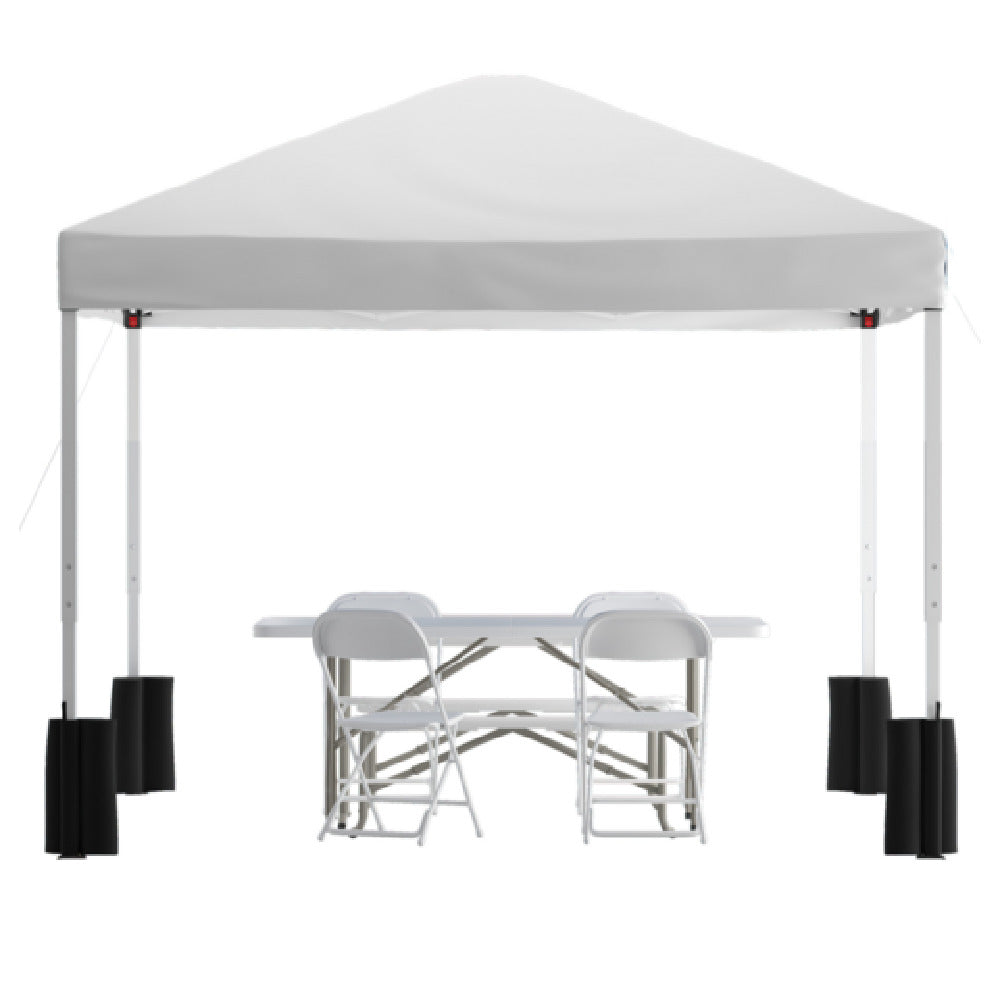 The Flash Furniture JJ-GZ10PKG183Z-4LEL3-WHWH-GG Otis Pop-up Canopy Tend and Folding Table With Chairs Set is a comprehensive outdoor event solution designed for commercial applications requiring portable shade and seating. This 10'x10' wheeled canopy tent features a durable aluminum frame with a white fabric top, supporting efficient setup and transport. Included are four foldable chairs with weather-resistant frames, a 6' bi-fold table with a carrying handle for ease of movement, and accessories such as four weight bags and a canopy carrying case. Engineered for outdoor foodservice, event, or hospitality environments, this set provides a stable shaded area with quick deployment capabilities and ease of maintenance, ideal for catering, festivals, or mobile vendors.
