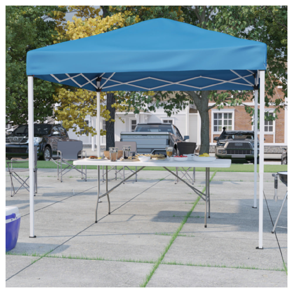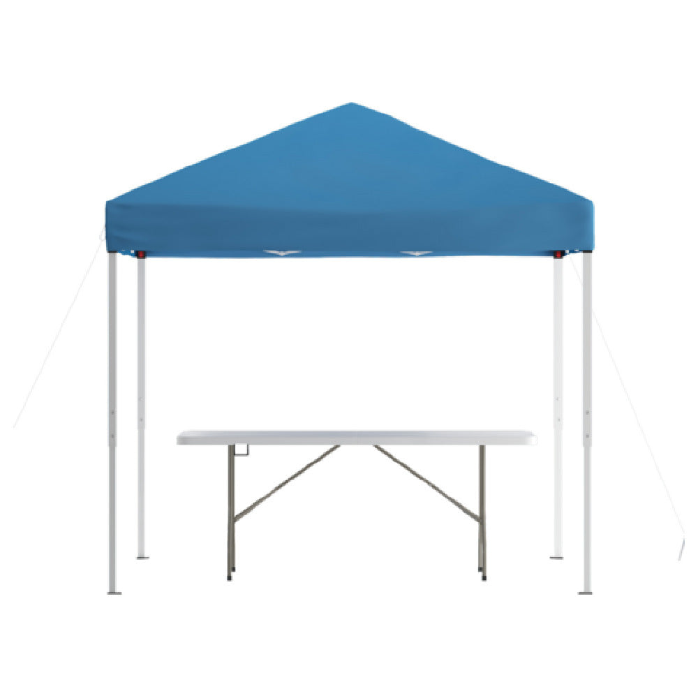 The Flash Furniture JJ-GZ88183Z-BL-GG Otis Pop-up Canopy Tend and Folding Table Set is a versatile outdoor pavilion system designed for commercial foodservice environments requiring quick setup and reliable shade coverage. This set features an 8' x 8' blue canopy tent with a durable carrying case, combined with a 6' bi-fold white table with an integrated carrying handle. Constructed from high-grade materials suitable for frequent deployment, this canopy and table combination delivers portability, stability, and weather resistance—making it ideal for catering, outdoor markets, trade shows, and hospitality events. Its technical design prioritizes easy assembly and robust performance in various outdoor conditions, supporting efficient workflow for event setups and temporary-service applications.