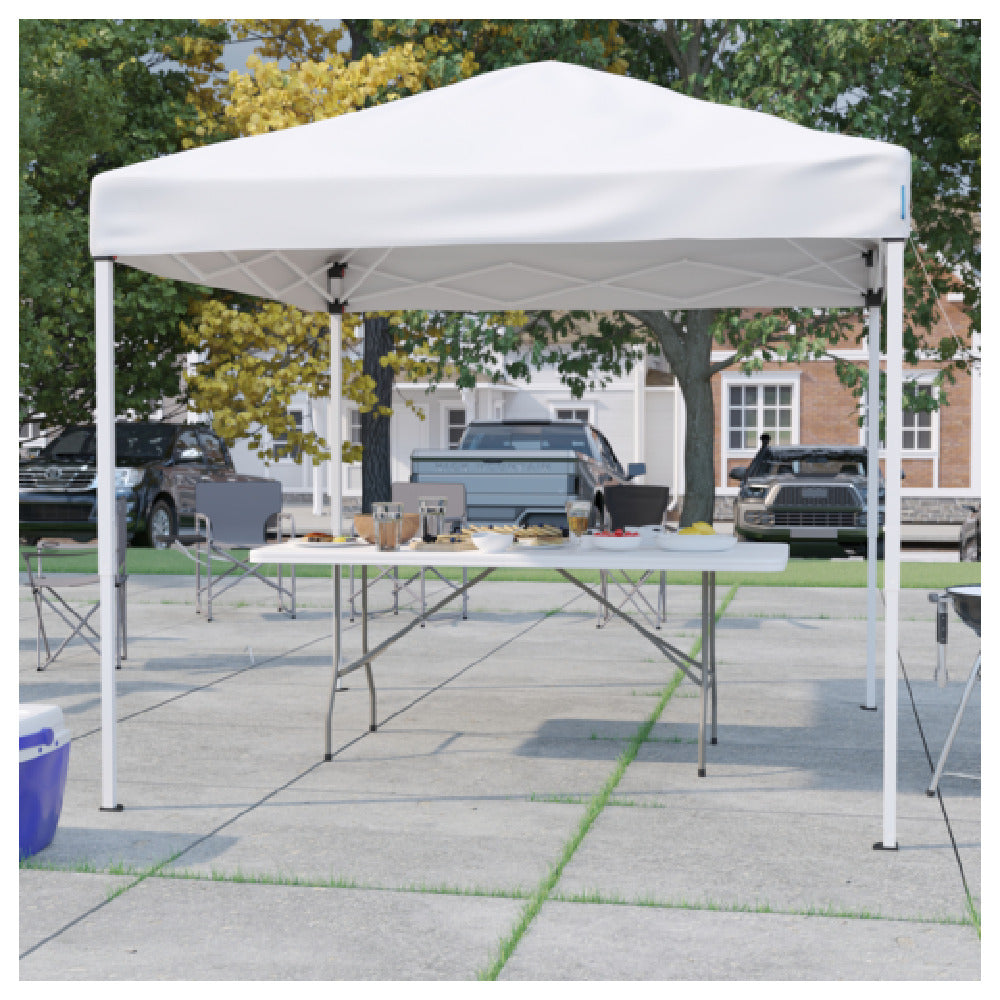 The Flash Furniture JJ-GZ88183Z-WH-GG Otis Pop-up Canopy Tend and Folding Table Set is a professional-grade outdoor event solution designed for commercial foodservice environments. This set features an 8' x 8' white canopy tent constructed for durability and quick deployment, complemented by a 6' bi-fold table with a comfortable carrying handle. Ideal for catering, outdoor markets, and concessions, the product provides quick assembly and portability, making it suitable for venues requiring reliable shade and versatile food service setup. The lightweight aluminum frame and polyester canopy material ensure ease of maintenance and resilience against weather conditions, while the technical specifications support robust outdoor operation—specifically, a canopy height of 97.5 inches and a total weight of 56 pounds.