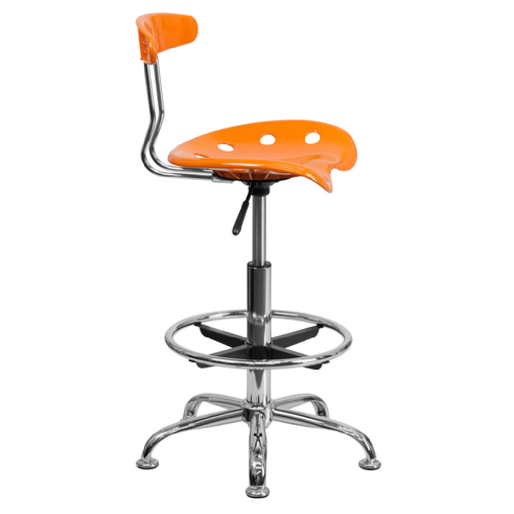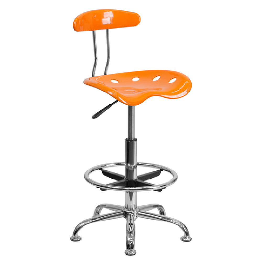 The Flash Furniture LF-215-ORANGEYELLOW-GG Swivel Drafting Stool Adjustable Height is a versatile work stool designed for professional and residential environments requiring ergonomic seating solutions. Constructed with high-density polymer components, it features a plastic tractor seat and plastic back for durability and ease of maintenance. The stool's pneumatic lift allows for an adjustable height range of 8-1/2 inches, supporting precise ergonomic positioning. Its sturdy chrome base and foot ring offer stability and comfort during prolonged use, making it suitable for drafting, design, or task seating in various workspaces. With its contemporary aesthetic and adjustable features, it is optimized for environments where functional seating and quick customization are essential, supporting detailed tasks and collaborative workflows.