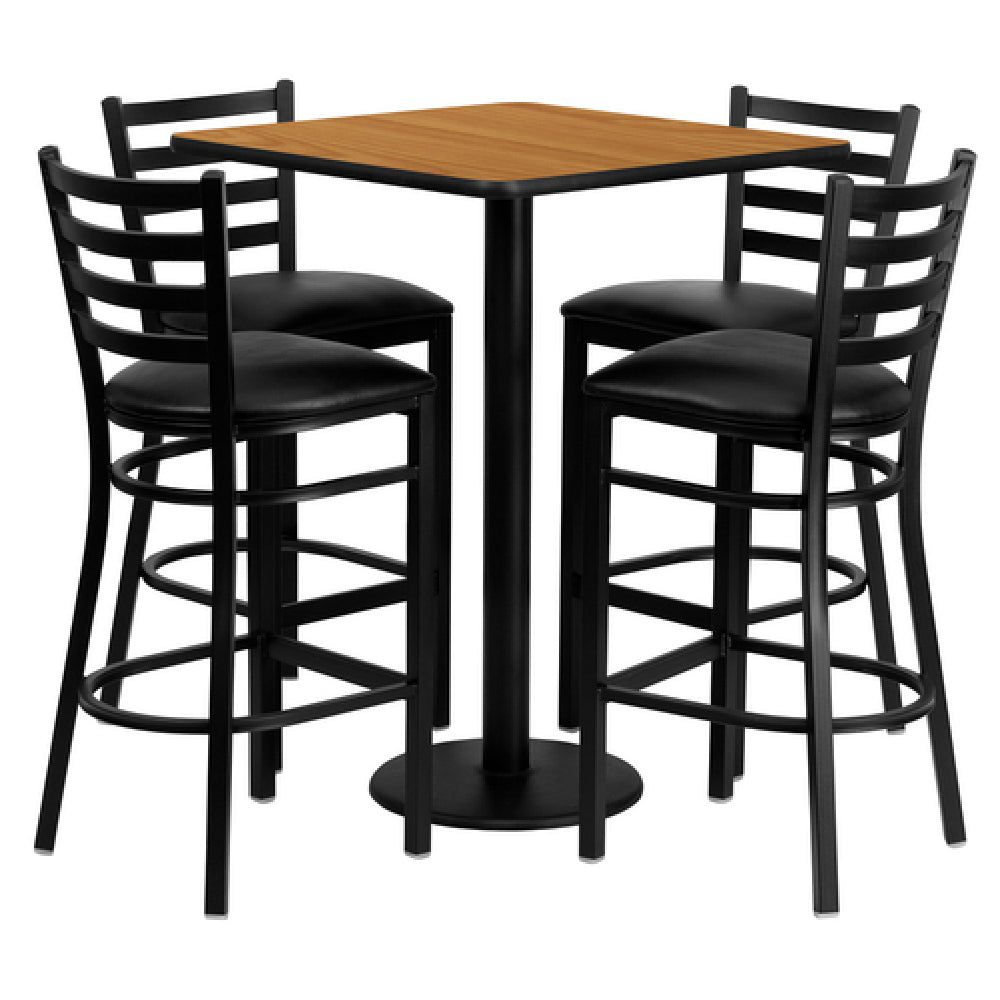 The Flash Furniture MD-0012-GG Table and Bar Stool Set is a durable indoor commercial furniture solution designed for versatile seating arrangements. This set includes a 30" by 30" square table with a black T-mold edge and high-impact melamine core MDF surface finished in natural laminate, providing resilience for high-traffic environments. The set features four 17" W x 18" D x 42-1/4" H black vinyl-upholstered bar stools with metal ladder backs, padded seats with fire-retardant foam, welded joint assembly, and a black powder-coated steel frame. Its construction emphasizes long-lasting performance suitable for hospitality, commercial lounge areas, and institutional spaces, with plastic floor glides for surface protection. Suitable for mid-volume use, the set offers technical robustness for both commercial and residential settings, supporting efficient workflow and ergonomic comfort.