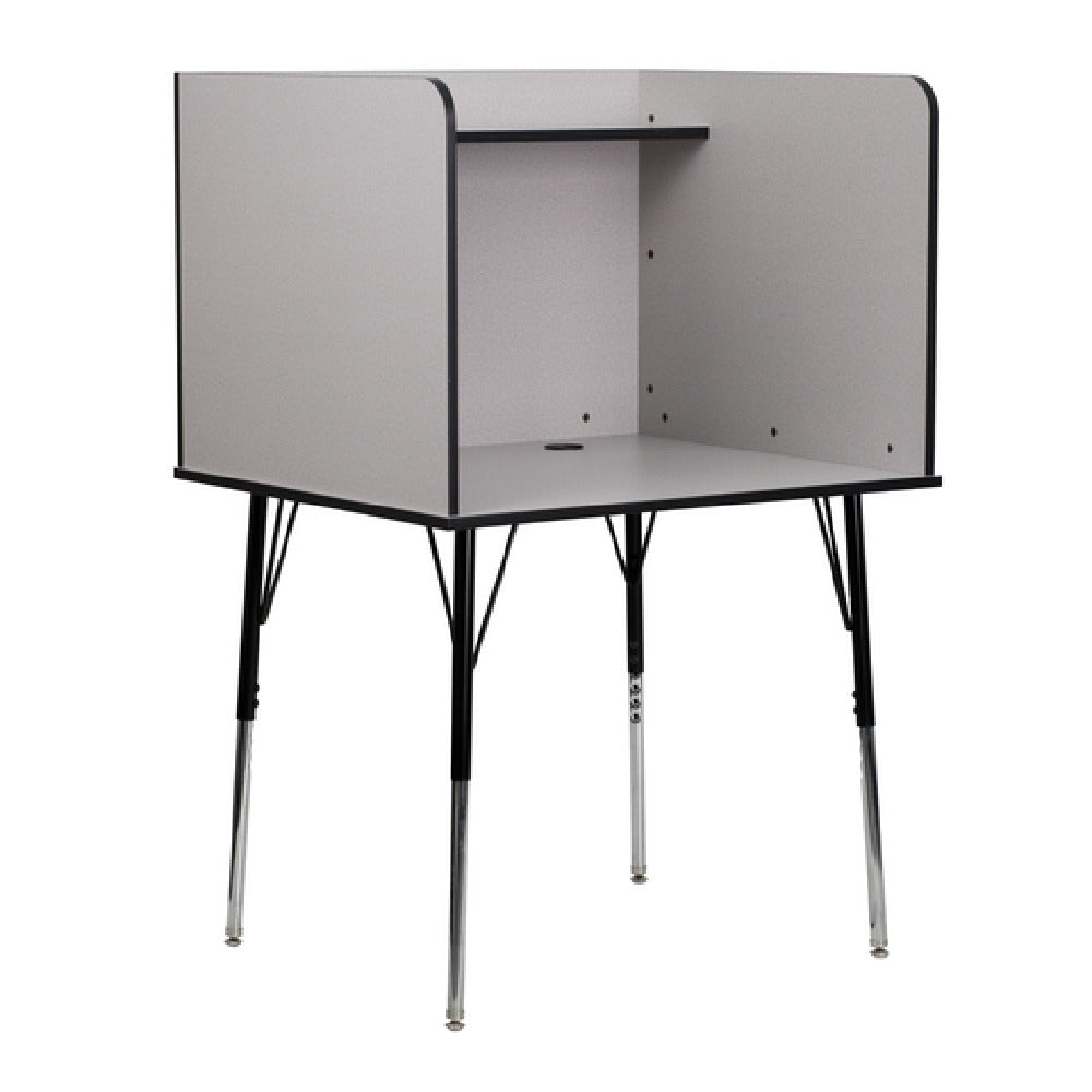 The Flash Furniture MT-M6221-SGLSC-GREY-GG Study Carrel is a standalone workspace designed for educational, professional, and institutional environments requiring individual focus areas. Constructed with a durable nebula grey finish, this study carrel features height-adjustable legs to customize ergonomic positioning and a top shelf for additional storage or display. Its wire management grommet ensures a clutter-free workspace, making it suitable for libraries, testing centers, or study rooms. With precise dimensions of 35.75\" width, 30\" depth, and a height of 53.5\", it provides a stable, functional, and customizable solution for focused work requiring minimal distraction and efficient organization.