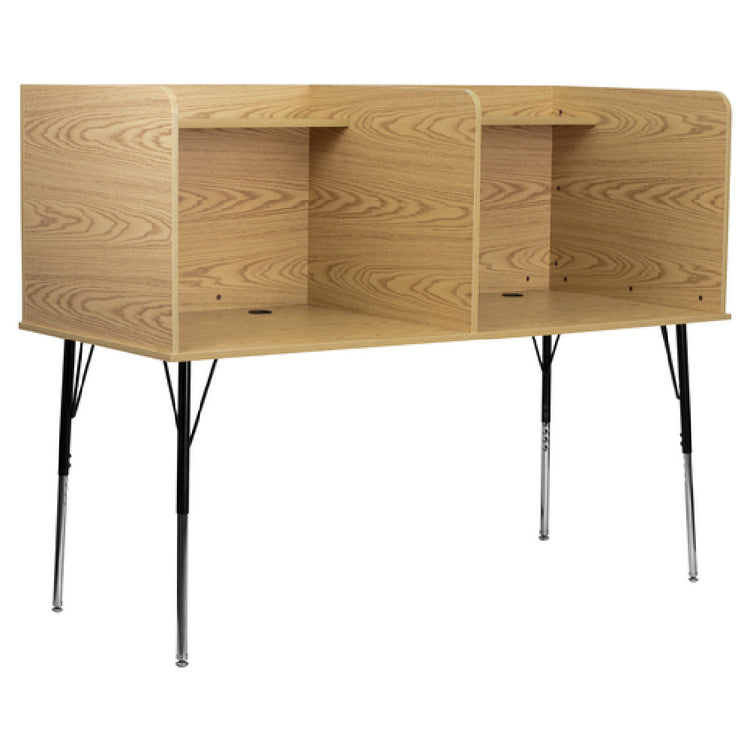 The Flash Furniture MT-M6222-DBLSC-OAK-GG is a standalone double study carrel designed for educational and professional environments requiring individual workspaces. Constructed with a durable oak finish, this study carrel features height-adjustable legs for custom ergonomic positioning and a top shelf optimized for additional storage or materials. Equipped with a wire management grommet, it ensures a clutter-free workspace, supporting analytical work, testing, or focused research in academic or corporate settings.