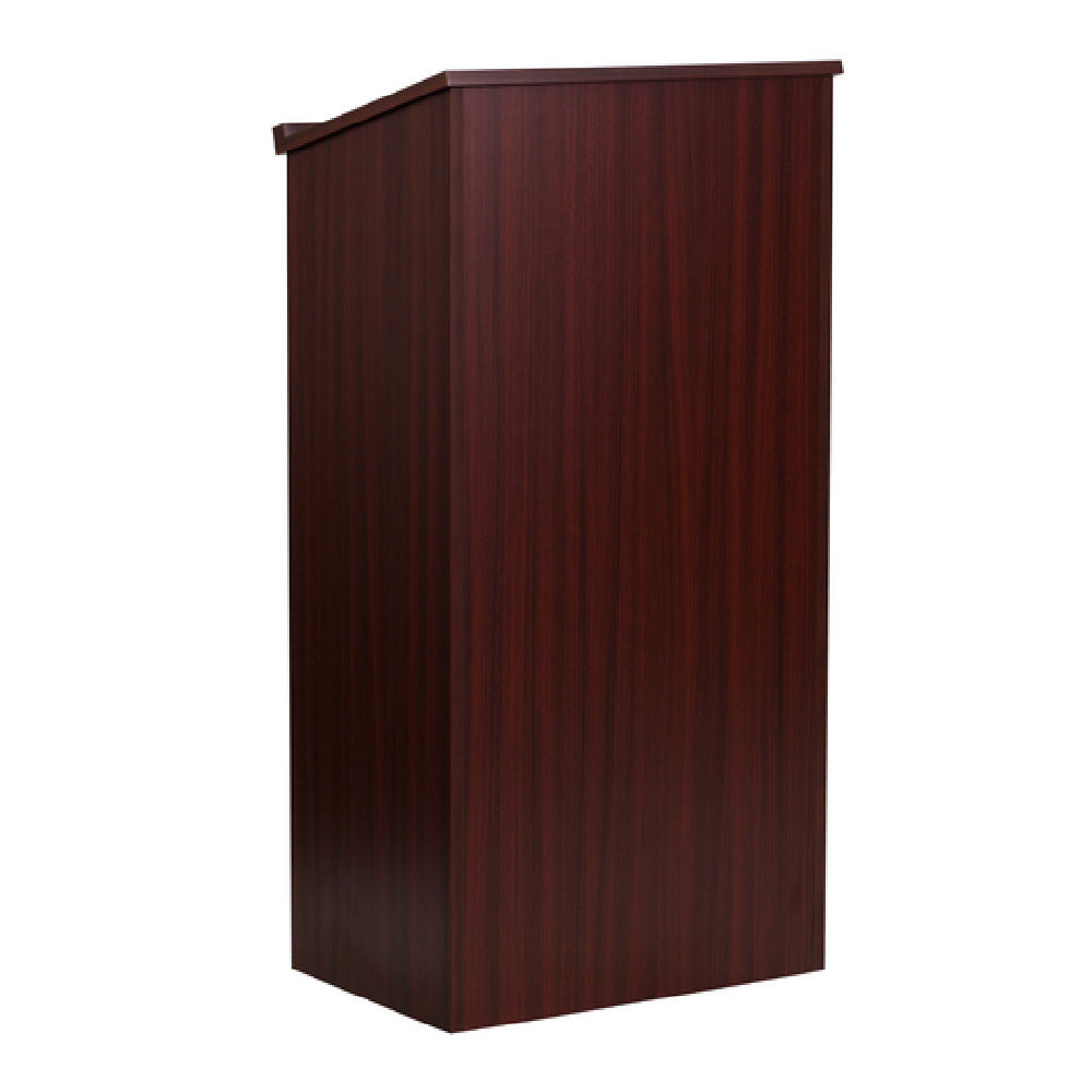 Flash Furniture, MT-M8830-LECT-MAH-GG, Stand-Up Lectern, 23"W x 15"D x 45-3/4"H, slanted surface with ledge, pencil slot on table surface, concealed storage area with 20-3/4"W x 13-1/2"D adjustable shelf, mahogany laminate finish, leveling glides (assembly required)