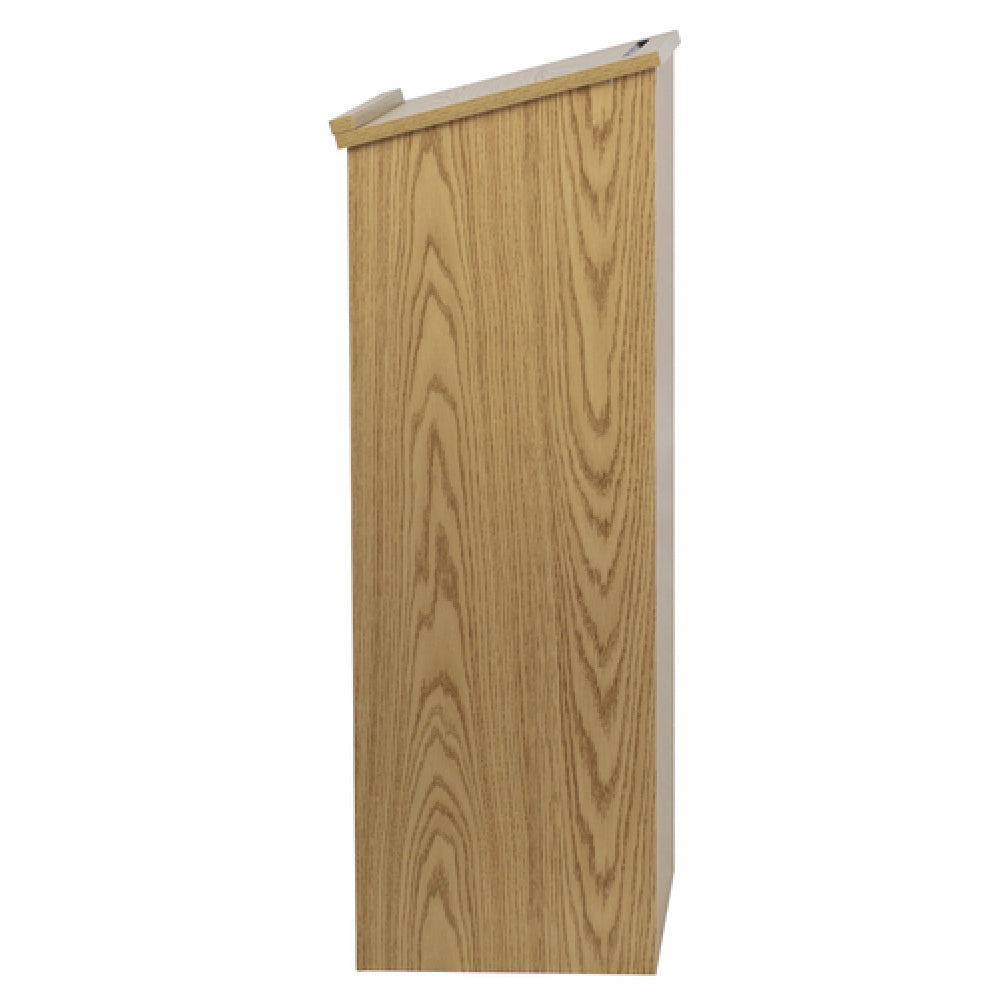 The Flash Furniture MT-M8830-LECT-OAK-GG Stand-Up Lectern is a commercial-grade podium designed for professional presentations, conferences, and educational environments. Measuring 23 inches wide by 15 inches deep and standing at 45-3/4 inches high, this floor model features a slanted surface with a built-in ledge for ease of use. Its oak laminate finish provides durability and a refined appearance suitable for high-traffic settings. Equipped with a pencil slot for note-taking and a concealed storage area—including an adjustable shelf measuring 20-3/4 inches by 13-1/2 inches—this lectern ensures organized functionality. The unit incorporates leveling glides for stability, making it adaptable to uneven flooring while maintaining a professional presentation environment. Crafted for versatility, it addresses the needs of conference centers, seminar rooms, and educational institutions seeking a durable, functional podium with ample storage capacity and precise dimensions.