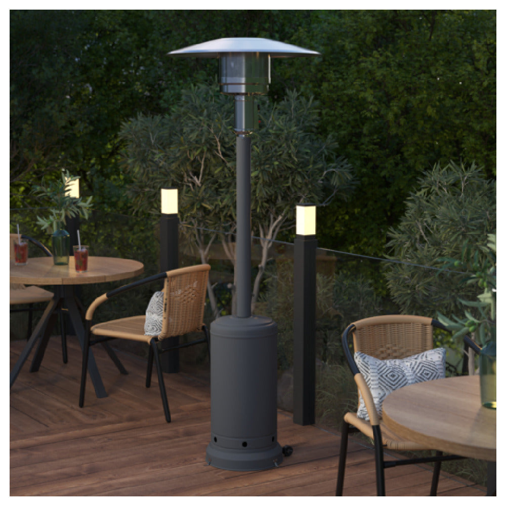 A commercial patio heater is a weather-resistant heating device designed for outdoor spaces in hospitality, foodservice, and recreational settings. It typically features a high BTU output, durable construction, and mobility for flexible outdoor placement. The Flash Furniture NAN-HSS-AGH-GY-GG Sol Patio Outdoor Propane Heater is constructed from stainless steel, measures 87 inches in height, and offers 42,000 BTU of thermal capacity, making it suitable for large-area outdoor heating. Installed in restaurant terraces, outdoor dining areas, or event venues, it provides consistent warmth for outdoor seasonal service and guest comfort, especially during colder weather conditions.