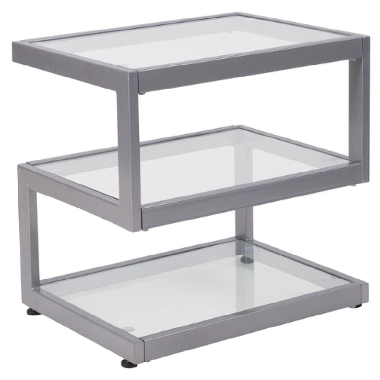 The Flash Furniture NAN-JH-1736-GG Ashmont Collection End Table is a contemporary rectangular side table designed for versatile use in commercial and hospitality environments. Measuring 21-1/4 inches in width, 15-3/4 inches in depth, and 21 inches in height, this end table features a 5mm thick clear tempered glass top supported by a silver powder coated S-shaped steel frame. Its structure combines durability with sleek modern aesthetics, suitable for lounges, seating areas, or waiting spaces requiring sturdy, easy-to-clean surfaces with a refined appearance.