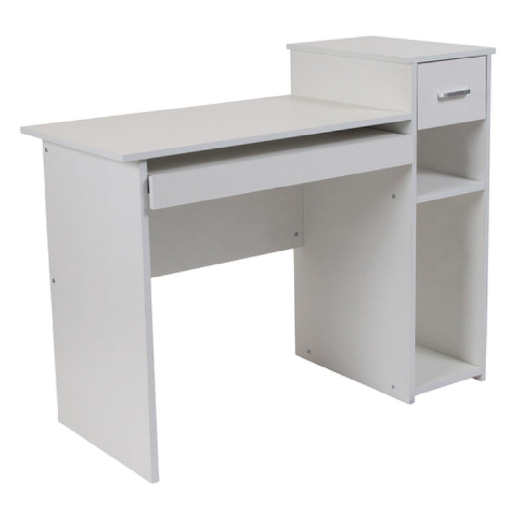 The Highland Park Computer Desk from Flash Furniture features a robust construction with a laminate finish, providing resistance against everyday wear and tear. It measures 42 inches in width, 19 inches in depth, and 29-1/2 inches in height, with a total weight of 73 lbs for stability. The desk includes a sliding keyboard tray measuring 29"W x 12"D, and features a partial privacy panel for semi-enclosed work areas. The open top compartment (9-1/2"W x 19"D x 6-1/2"H) and a larger open bottom space (9-1/2"W x 19"D x 19"H) offer flexible storage options for office supplies and documents. Its construction emphasizes durability with a laminate surface designed for commercial use, supporting moderate workloads in professional offices. With a product category designation as an office table, it is straightforward to incorporate into various workspace layouts.