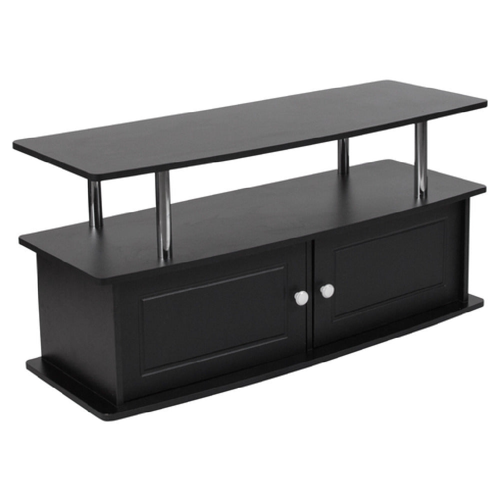 The Evanston TV Stand features a 43-1/4" wide, 16" deep laminate top supported by a stainless steel frame, with overall height of 21-1/2 inches and a weight of 59 lbs. It is constructed from high-quality laminate and stainless steel, ensuring durability across extensive use. The unit operates without electrical requirements and is finished in a sleek black color. Its design includes floor glides for positioning flexibility and a load capacity suitable for flat panel TVs up to 42 inches. The enclosed cabinets are designed with laminated surfaces and white door pulls, providing secure storage with minimal maintenance needed. It ships typically within 1 to 2 days, without certification markings, and is suited for indoor use in professional environments.