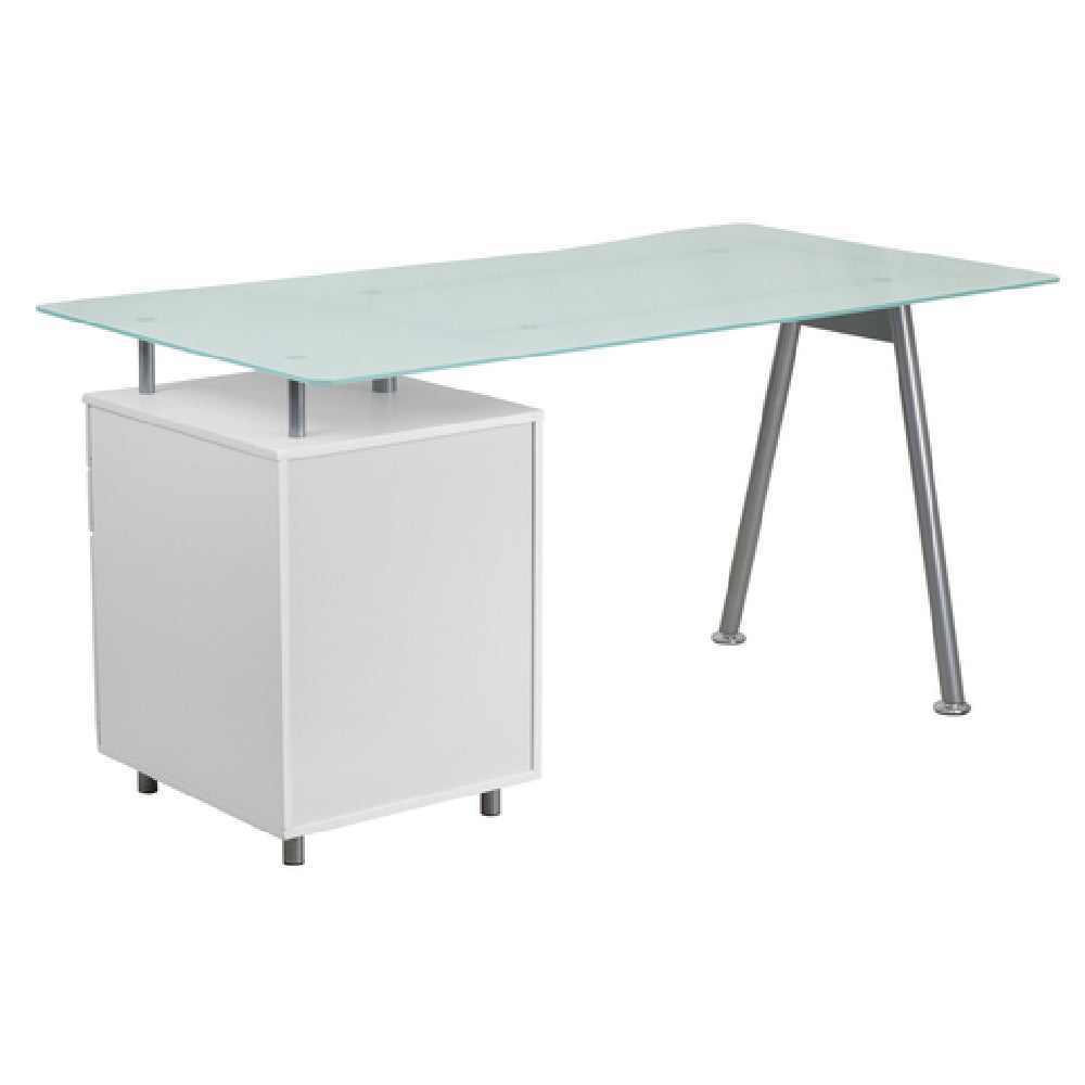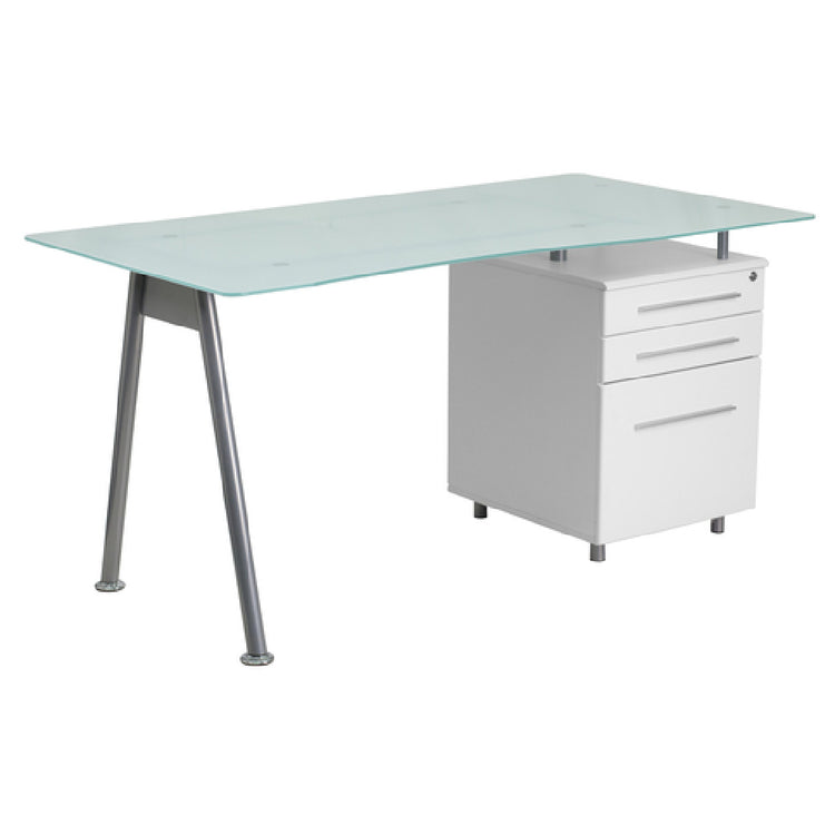 Flash Furniture, NAN-WK-021-GG, Computer Desk, 59"W x 31-1/2"D x 29-1/2"H, frosted tempered glass top, 19"W x 21-1/4"D x 25"H pedestal, (2) 15-1/2"W x 15"D x 3-1/4"H box drawers, (1) 15-1/2"W x 15"D x 12"H file drawer, includes lock and key, silver bar pulls, silver powder coated metal frame, self-leveling floor glides, white (assembly required) (shipped in 2 boxes) (in stock items usually ship within 24 hours)