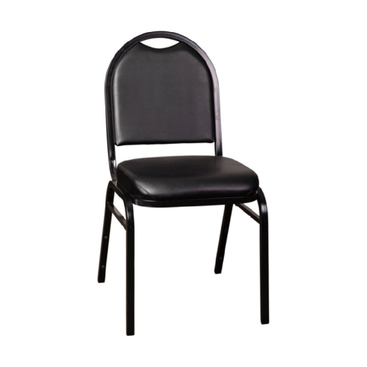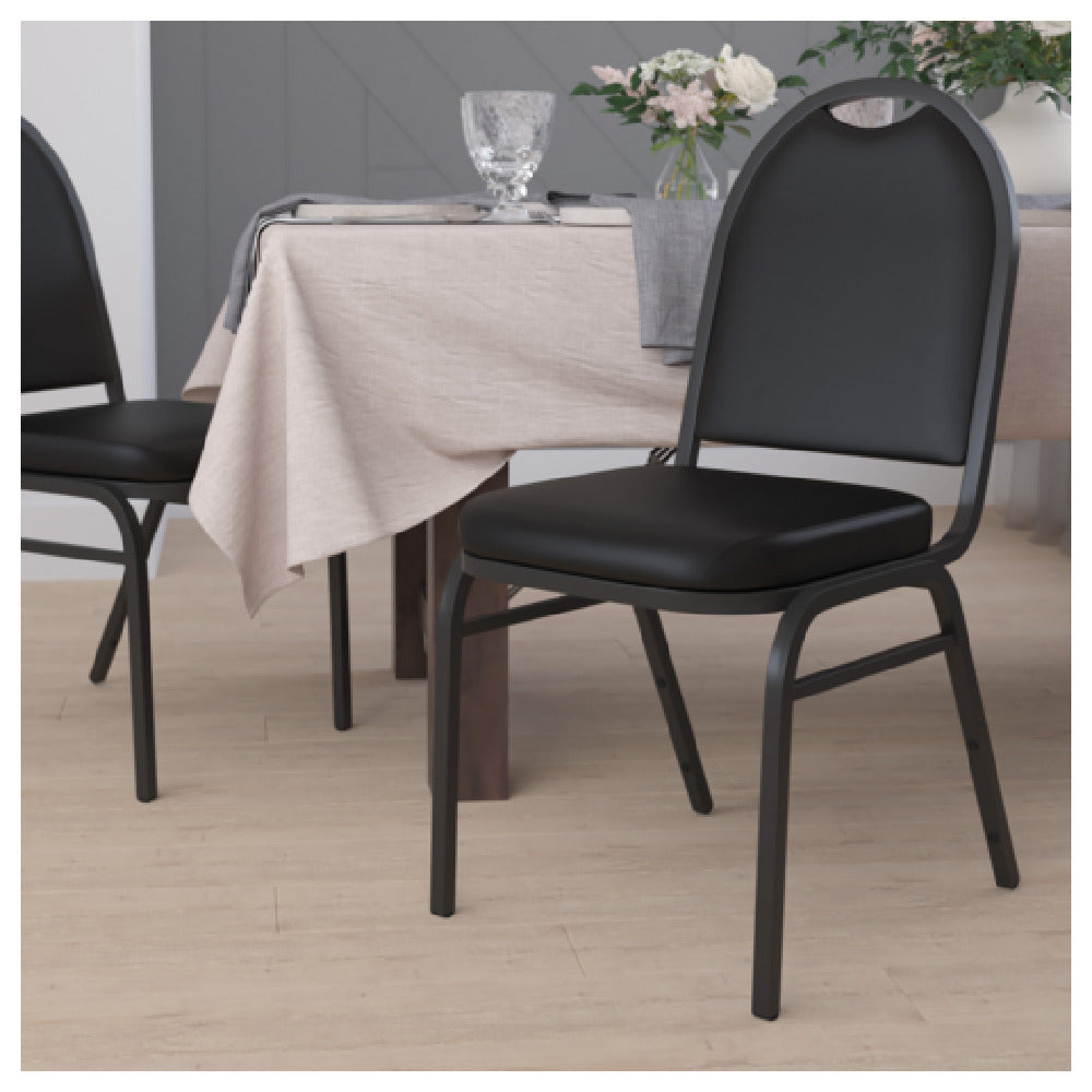 The Flash Furniture NG-ZG10006-BK-BK-GG HERCULES Series Commercial Grade 500 LB. Capacity Dome Back Stacking Banquet Chair in Black Vinyl With Black Metal Frame is a robust, high-capacity seating solution designed for demanding foodservice environments. Engineered for durability and ease of maintenance, this indoor stacking chair features a sturdy black metal frame and a resilient black vinyl upholstered seat and dome back. Its 500-pound weight capacity makes it suitable for a variety of commercial settings such as banquet halls, catering events, and institutional dining areas, providing stable and comfortable seating for high-volume use. The precise dimensions—34.25 inches in height, 17.5 inches wide, and 22.25 inches deep—ensure compatibility with standard banquet and event tables, supporting efficient setup and storage.