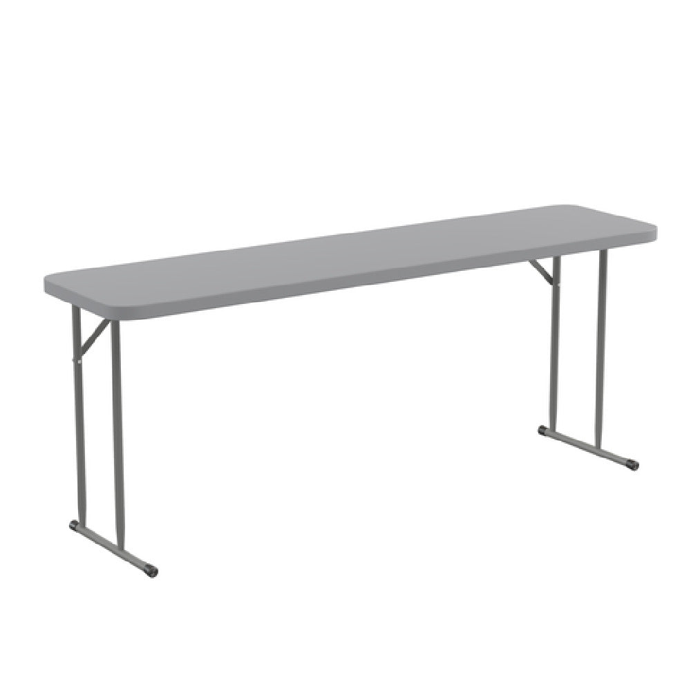 The Flash Furniture RB-1872-GY-GG Training Folding Table is a commercial-grade rectangle table designed for versatile indoor and outdoor use. Measuring 72 inches in width, 18 inches in depth, and 29 inches in height, this portable table supports seating for up to three adults, making it suitable for training rooms, event spaces, and catering applications. Its 1-3/4-inch thick gray plastic top offers impact, stain, and waterproof resistance, while its gray powder-coated metal locking legs ensure stability under load, with a static capacity of 220 pounds. Engineered for durability and easy maintenance, this model provides a reliable surface for high-traffic environments, combining robust construction with lightweight portability for seamless workflow integration in busy foodservice and hospitality setups.