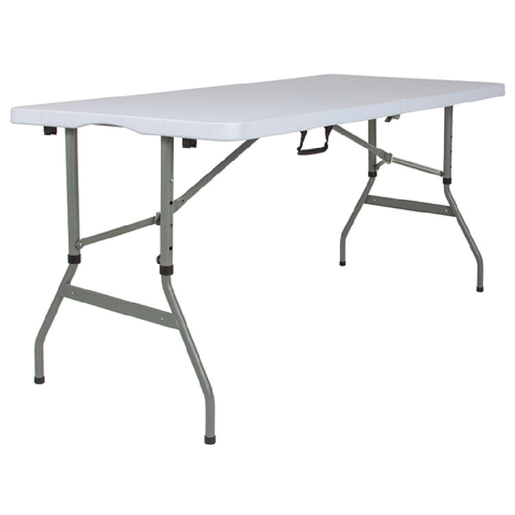 The Flash Furniture RB-3050FH-ADJ-GG commercial rectangular folding table offers a waterproof, impact, and stain-resistant granite white top ideal for demanding foodservice use. Its 1.5'' thick tabletop ensures durability, while locking gray powder-coated legs provide stability. The adjustable height frame allows tailored ergonomics, and the folding design with a convenient carrying handle facilitates easy storage and transportation. Suitable for busy catering environments, it supports workflow efficiency with rapid deployment and cleanup.