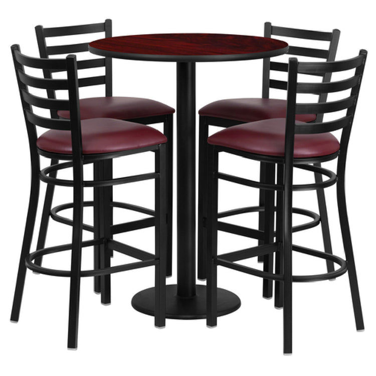 The Flash Furniture RSRB1026-GG features a 30-inch diameter round table heighted at 42 inches, constructed from MDF with a high-impact melamine core and finished in mahogany laminate. The set includes four metal ladder back stools upholstered in burgundy vinyl with 2-1/2 inch fire-retardant foam cushions, positioned on an 18 gauge steel frame with a black powder coat. The product weighs 124 lbs and ships in five boxes, enabling straightforward assembly. The design includes a propylene finish suitable for indoor use, with plastic floor glides to protect flooring surfaces. It operates without electrical requirements and is engineered to support moderate-use environments such as cafes, bars, or casual dining areas.
