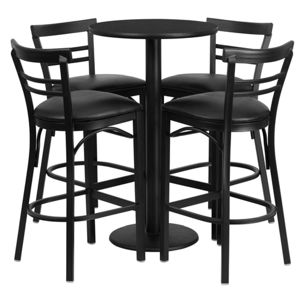 The Flash Furniture RSRB1033-GG Table and Bar Stool Set is a commercial-grade indoor furniture solution designed for versatile hospitality and dining environments. This set features a 24-inch diameter round table with a high-impact melamine core surface, black laminate finish, and a T-mold edge for durability against daily commercial use. It includes four metal ladder-back bar stools upholstered with black vinyl, each with a 2-1/2 inch fire-retardant foam cushion, welded joint assembly, curved support bars, and footrests. The cast iron round base with black powder coating ensures stability and corrosion resistance. Engineered for stability and easy maintenance, this set is suited for cafes, bars, or casual dining spaces, measuring 42 inches in height, with shipping weight of 107 lbs.