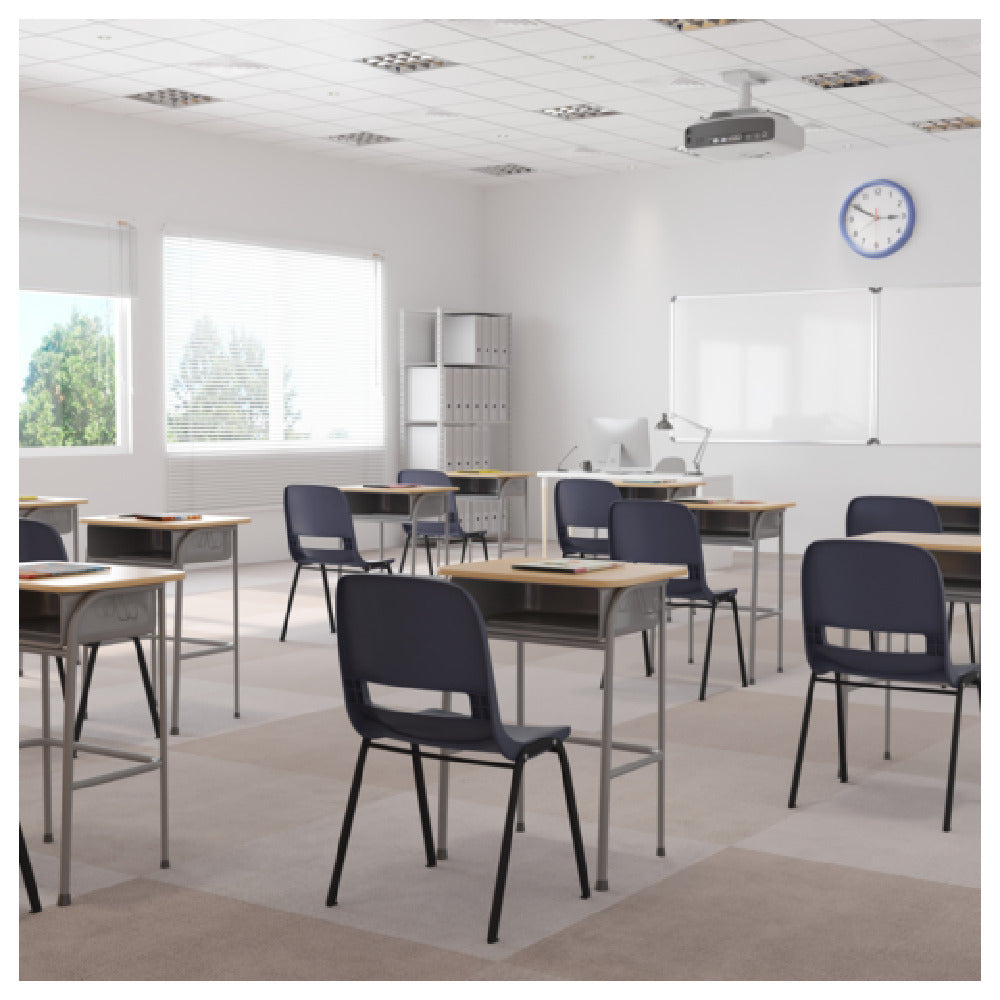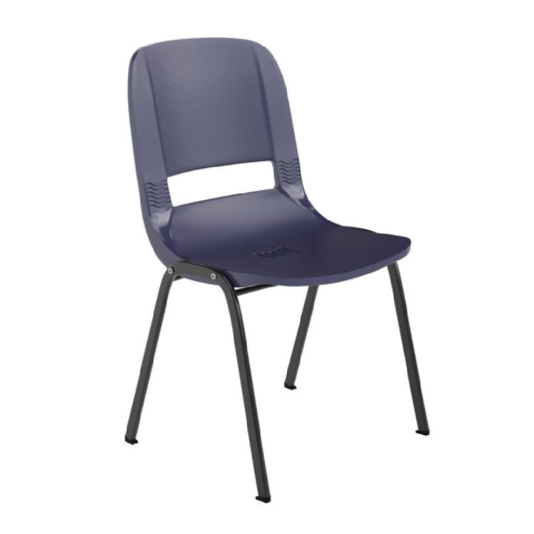 The Flash Furniture Hercules Series Student Shell Stacking Chair (model RUT-16-PDR-NAVY-GG) is a commercial-grade stacking chair designed for educational and indoor/outdoor institutional environments. Crafted from durable plastic with ergonomic seating features, including vented backs and seat drain holes, it provides comfort and practicality for users from 3rd to 7th grade. Its black powder-coated metal frame combines strength with corrosion resistance, supporting a weight capacity of 661 lbs. The chair's design facilitates efficient storage, stacking up to 15 high, and it ships fully assembled, made to meet the demands of high-traffic settings. Its suitability for both indoor and outdoor applications makes it ideal for classrooms, cafeterias, and other institutional facilities seeking reliable, resilient seating solutions.