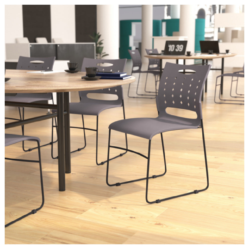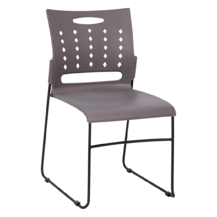 The Flash Furniture RUT-2-GY-BK-GG Hercules Series Stacking Chair is a commercial-grade side stacking chair designed for high-support indoor seating applications. Constructed with a durable polypropylene seat and perforated back, this chair features a black powder-coated steel sled base frame and a 881 lb. weight capacity, making it suitable for busy hospitality environments and conference rooms. Its ergonomic design provides comfort during extended use, with easy stacking capability for space-efficient storage. Fully assembled and lightweight at 14 lbs, it offers an effective solution for versatile seating needs in high-traffic foodservice or event settings.