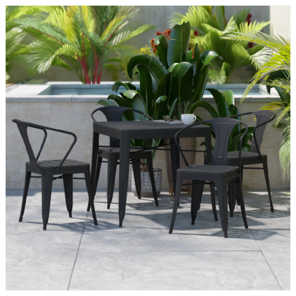 Built with weather-ready materials, the Flash Furniture SB-T11C4-T-BK-GG Helvey Collection offers reliable outdoor seating, ideal for moderate outdoor dining traffic, with a compact footprint and restaurant-ready durability. The set’s heavy-duty construction and weatherproof features support continuous operation in hospitality outdoor environments without frequent replacement.