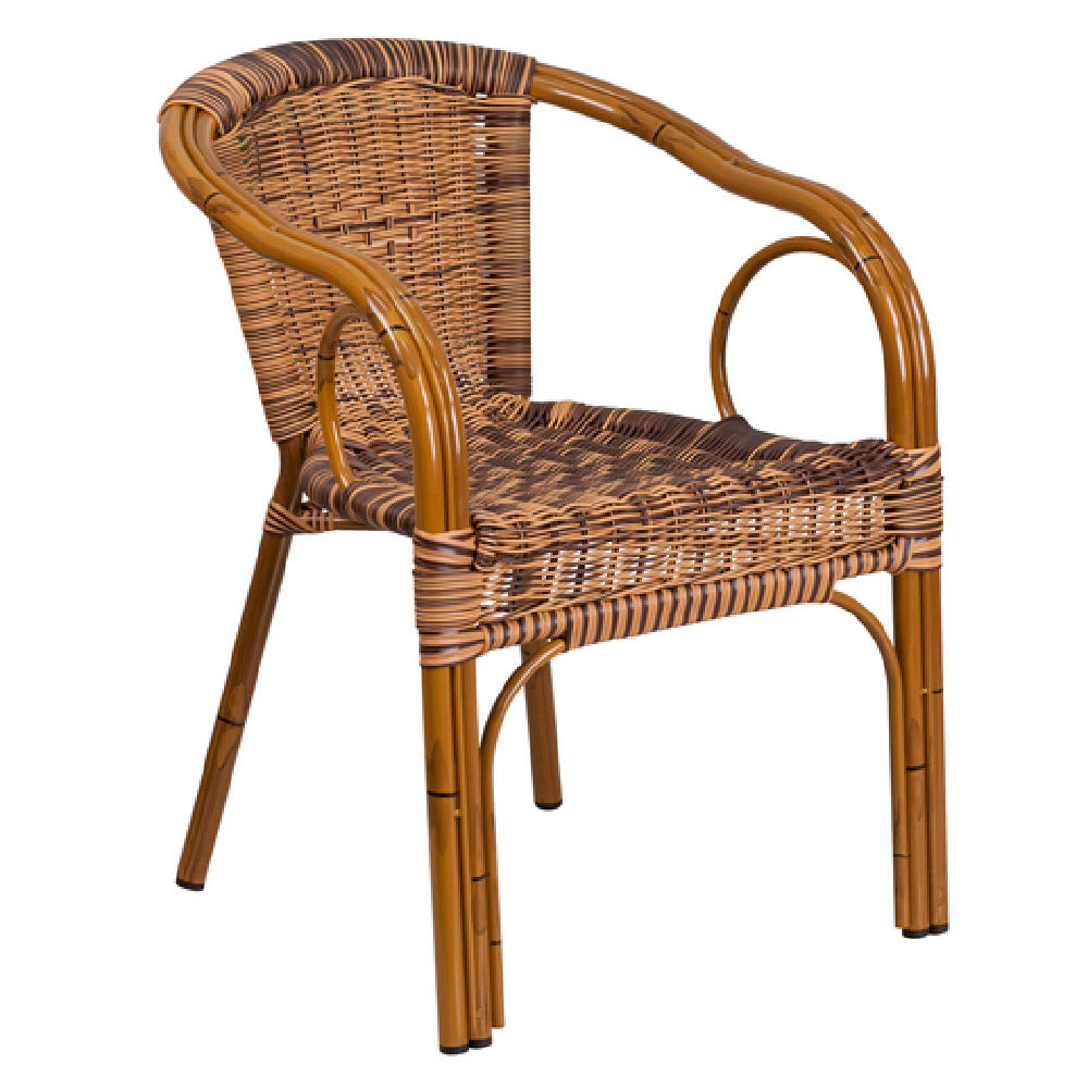 The Flash Furniture Cadiz Series Patio Stacking Armchair features a model number SDA-AD632009D-1-GG with a height of 30.25 inches, width of 22 inches, and depth of 25.5 inches, weighing approximately 10 pounds. Constructed with an aluminum frame and rattan seat/back, it withstands typical outdoor temperature ranges while maintaining structural integrity. The chair is fully assembled, requiring no additional tools for setup. Designed for moderate outdoor foot traffic, its lightweight nature facilitates repositioning and cleaning. The plastic floor glides enable floor protection and easy mobility, making it suitable for various patio configurations in commercial foodservice environments.