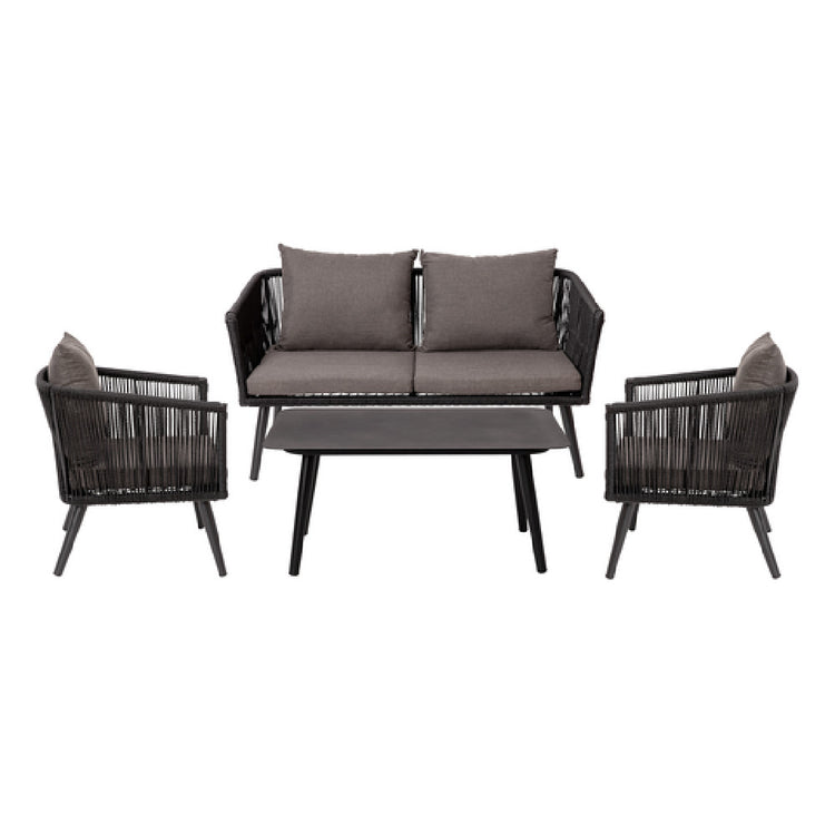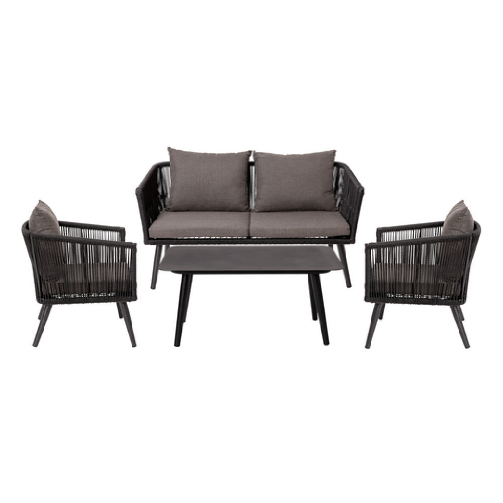 This 4-piece patio set caters to commercial outdoor settings requiring reliable durability and easy upkeep. Its woven polyethylene construction on the chairs guarantees weather resistance and strength, while the removable cushions facilitate quick cleaning cycles. The metal coffee table complements the seating with sturdy construction suitable for daily use, supporting moderate guest volumes in outdoor hospitality venues. Designed for seamless integration into outdoor dining workflows, this set optimizes both aesthetic appeal and functionality with minimal maintenance.