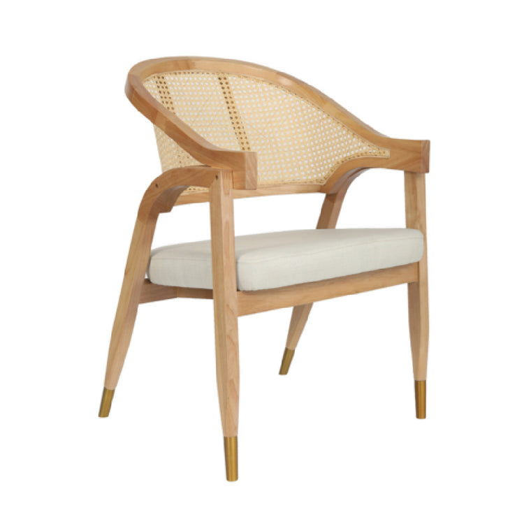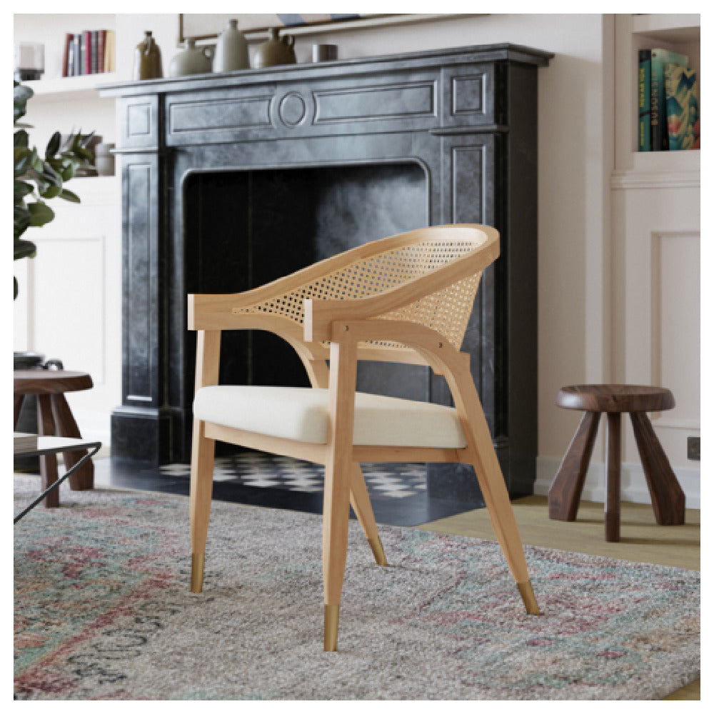 The Naomi dining & accent chair operates without electrical requirements, relying on its solid wood and cane rattan materials for structural integrity. The chair's dimensions—22.75 inches wide, 24 inches deep, and 33 inches high—ensure ergonomic comfort with a weight of 26 pounds for ease of handling. Its construction uses high-quality solid wood framing, finished in a natural tone that complements various interior styles. The padded seat offers a comfortable experience suitable for extended periods of sitting, while the cane rattan back provides aesthetic detail and airflow. The model is stabilized with gold-tipped legs, enhancing both durability and visual appeal, and it accommodates typical indoor environments with standard cleaning routines for upkeep. It does not include electrical components or refrigeration elements, focusing solely on seating functionality.