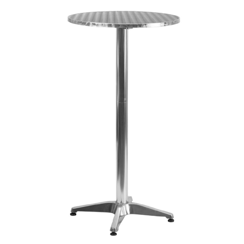 The Flash Furniture TLH-059A-GG Table is a commercial-grade outdoor and indoor table designed for versatile use in hospitality and foodservice environments. Featuring a durable stainless steel top with a 23-1/4" diameter and a bar height of 45", this round table provides a sturdy and corrosion-resistant surface suitable for high-traffic areas. The aluminum base and column contribute to its lightweight yet resilient construction, making it ideal for settings requiring frequent repositioning. Technical specifications include a 21.7 lbs weight, foldable top operated via a push button, and plastic floor glides for surface protection, facilitating quick setup and easy maintenance.