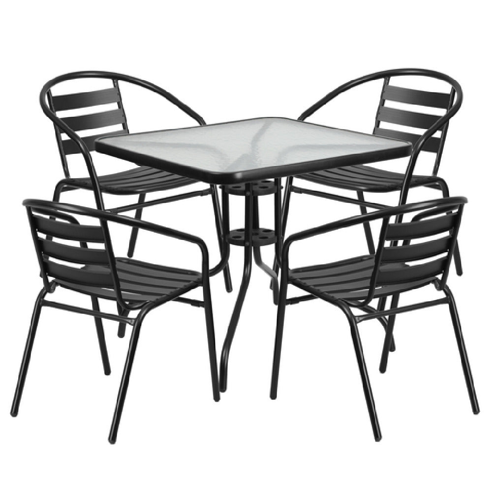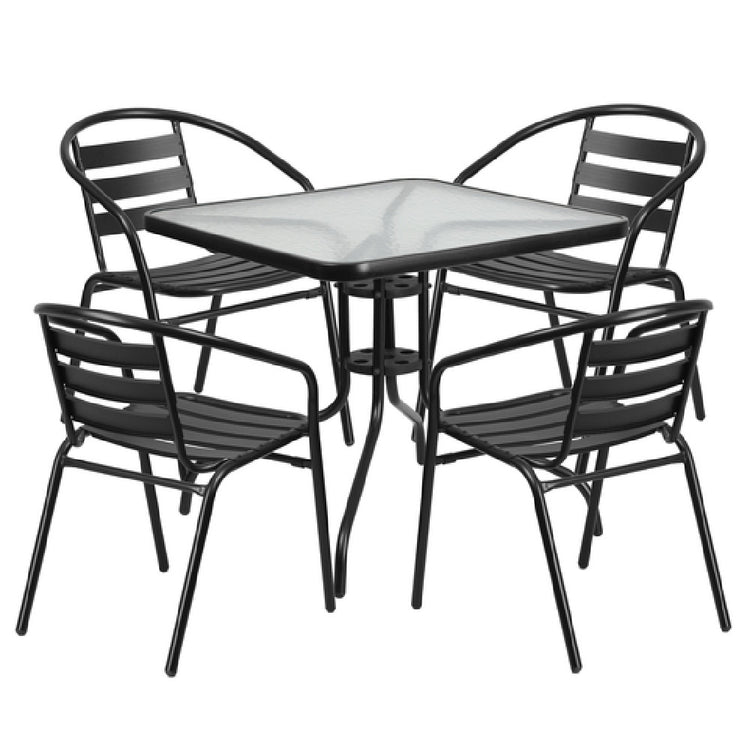 The Flash Furniture TLH-0732SQ-017CBK4-GG Chair & Table Set is a commercial-grade outdoor furniture ensemble designed for versatile use in restaurant patios, cafes, and hospitality settings. This set features a square 31-1/2" by 31-1/2" table with a durable 5mm thick glass top and a 1-3/8" thick edge, supported by a robust black powder-coated metal frame with protective plastic floor glides. The set includes four stackable cafe armchairs with curved black aluminum triple slat backs and textured black seats, offering lightweight mobility and weather resistance, suitable for both indoor and outdoor environments. Precise specifications include a total weight of 69 lbs, and the set is engineered for easy maintenance and longevity, perfect for high-traffic commercial spaces requiring resilient, stylish furniture with straightforward setup and upkeep.