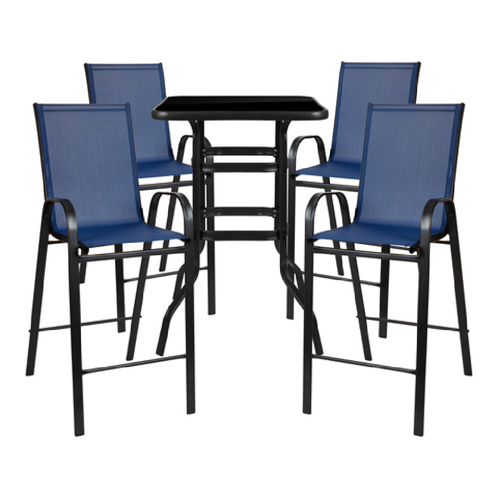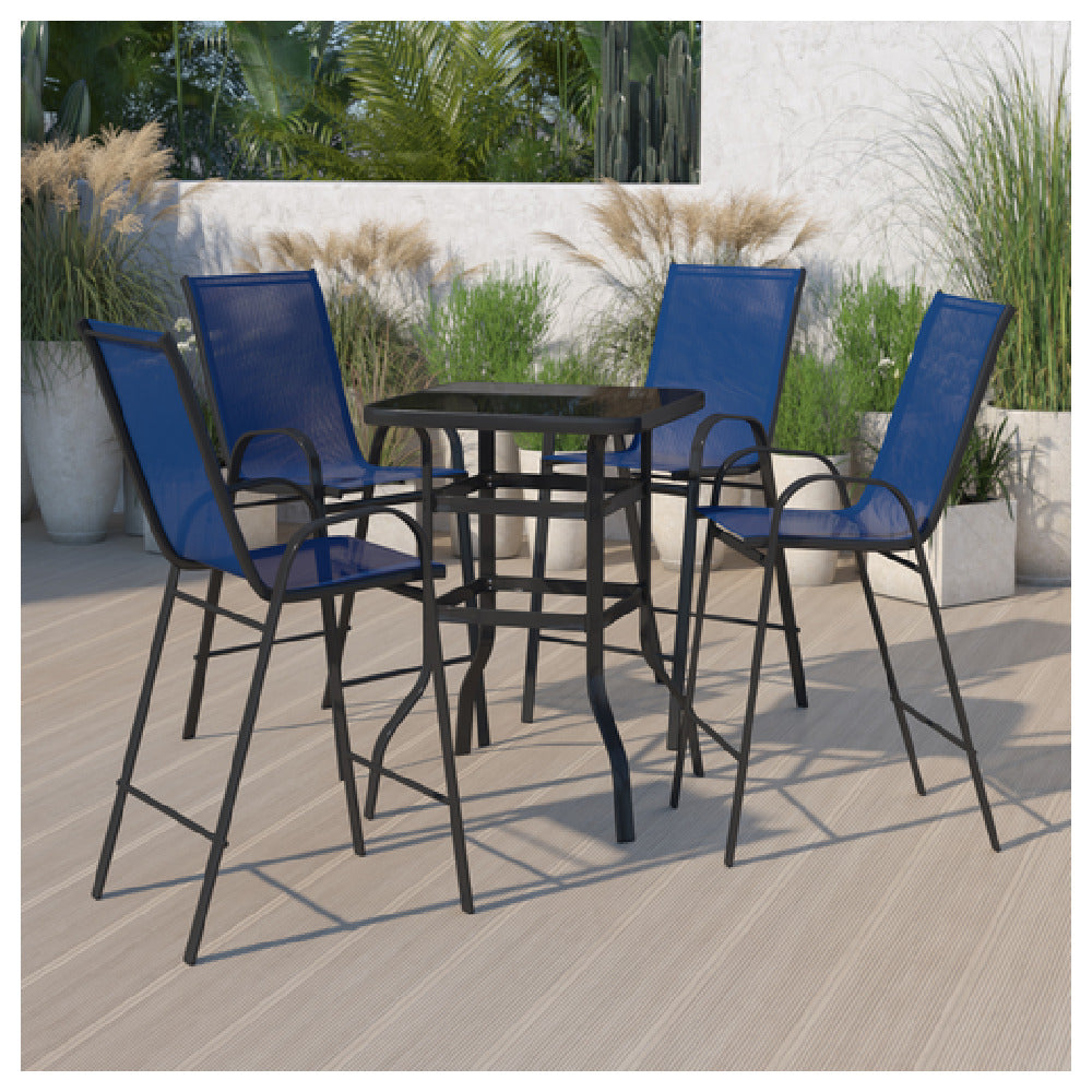 The Flash Furniture TLH-073H092H4-NV-GG Outdoor Dining Set is a commercial-grade 4-piece outdoor furniture ensemble designed for hospitality venues, cafes, and patio applications. This set features a square glass bar table with a clear tempered glass surface supported by a welded powder-coated steel frame, ensuring durability against outdoor elements. The inclusion of four navy stools complements the set, making it suitable for seating small groups in high-traffic outdoor foodservice areas. Its construction emphasizes robustness, weather resistance, and stability, making it a reliable addition to restaurants, bistros, and catering settings seeking stylish yet resilient outdoor furnishings.